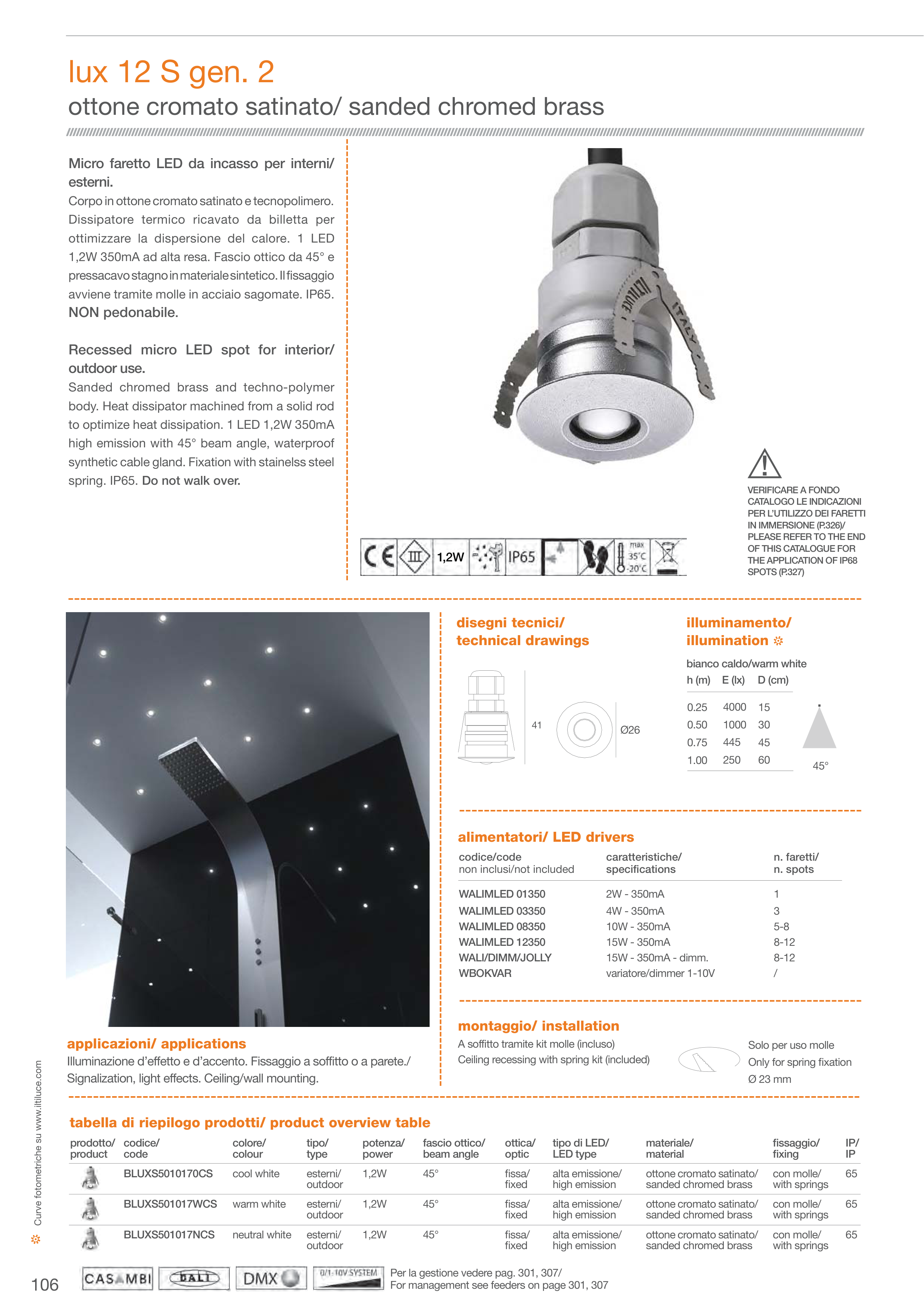 Illuminazione d’effetto e d’accento. Fissaggio a soffitto o a parete./