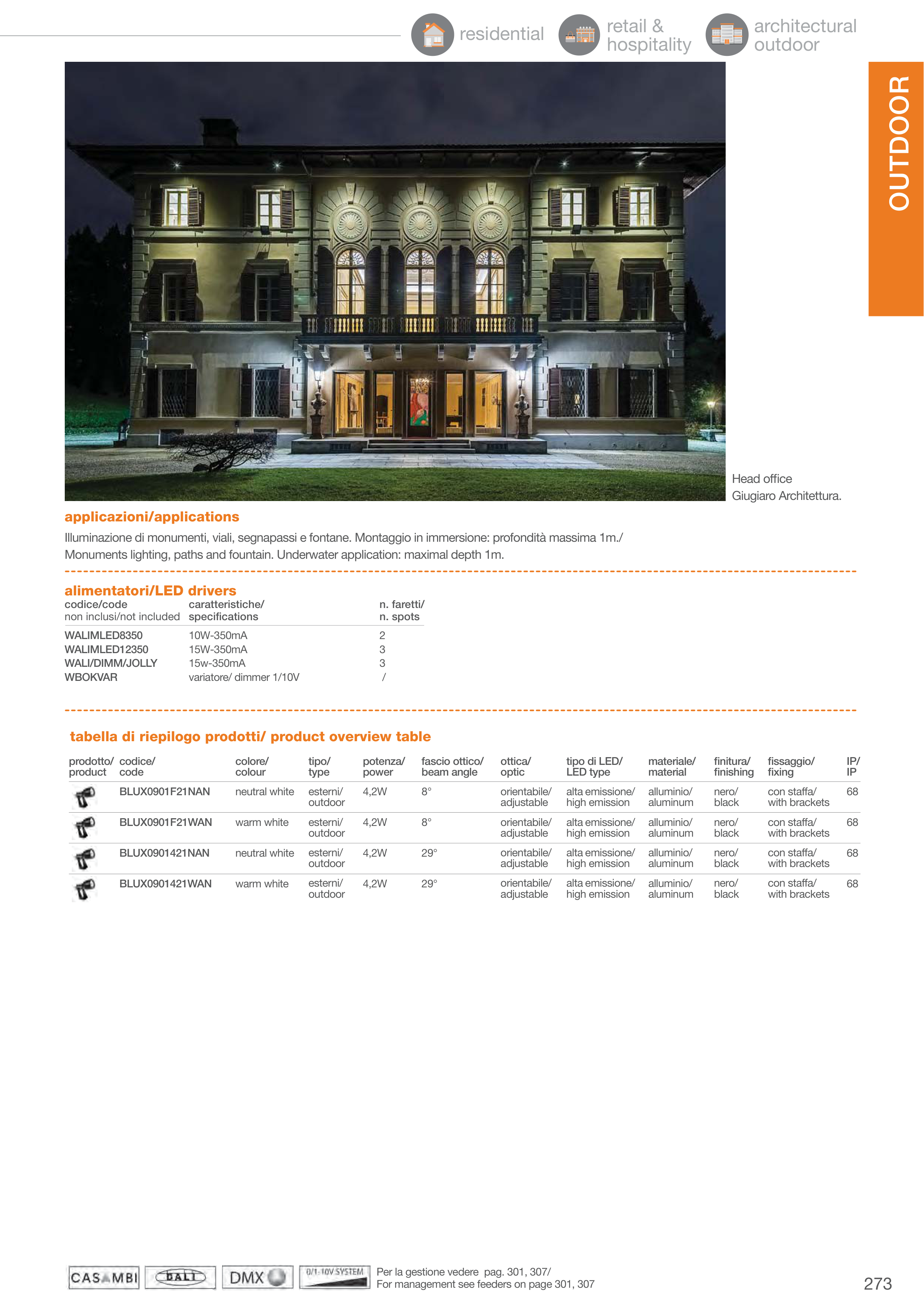 Illuminazione di monumenti, viali, segnapassi e fontane. Montaggio in immersione: profondità massima 1m./