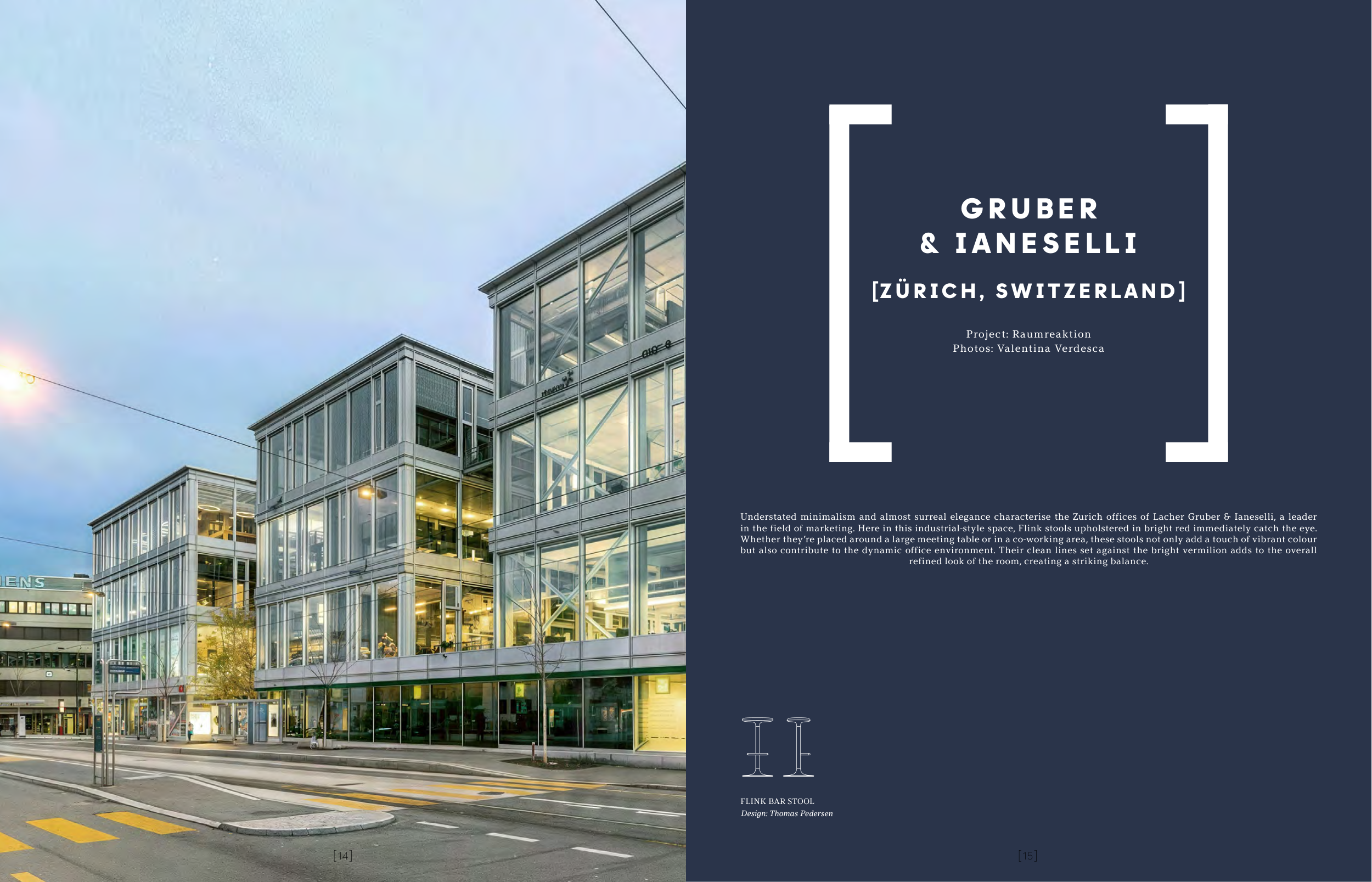 in the field of marketing. Here in this industrial-style space, Flink stools upholstered in bright red immediately catch the eye.