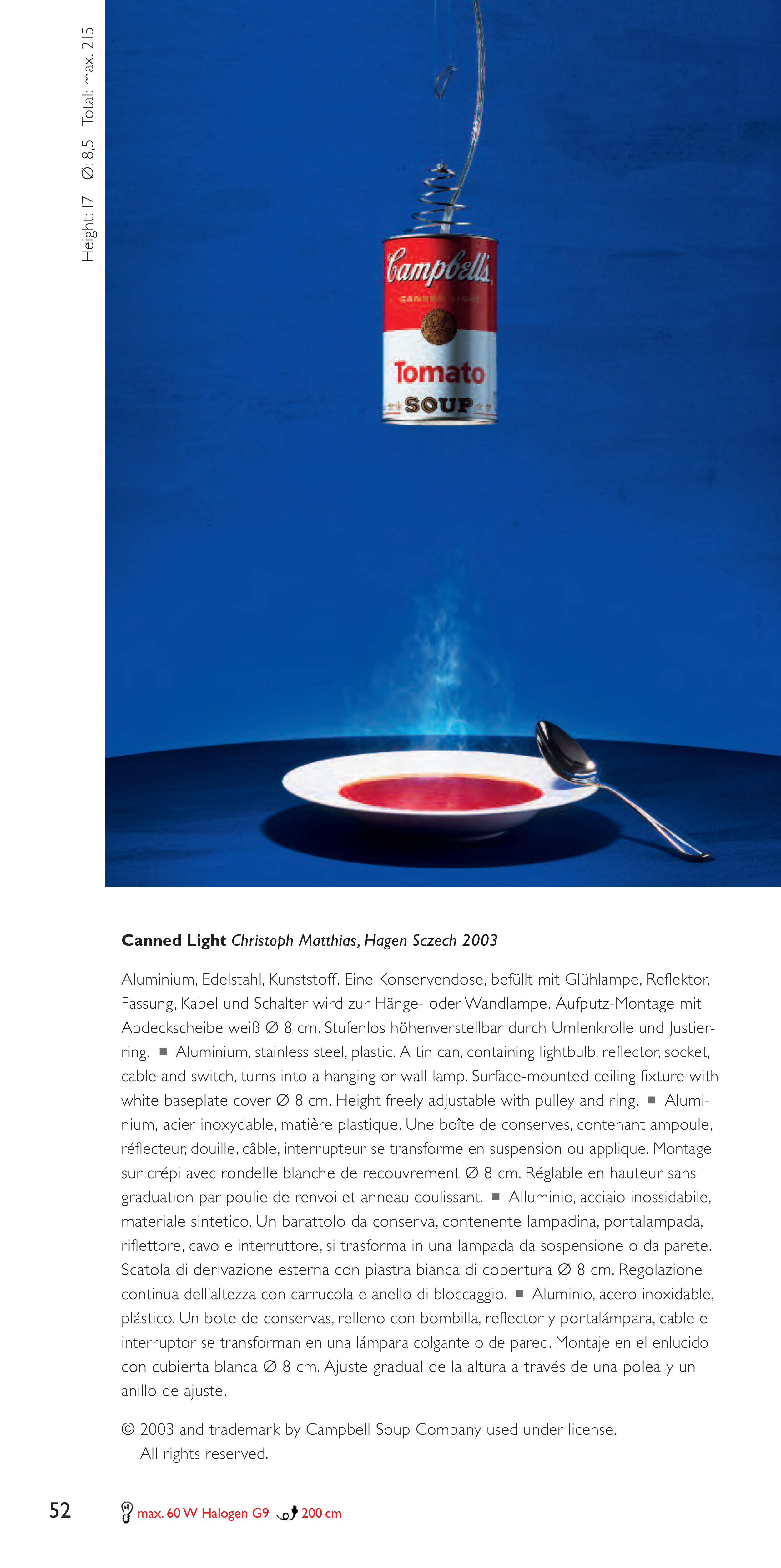 Aluminium, stainless steel, plastic. A tin can, containing lightbulb, reflector, socket,