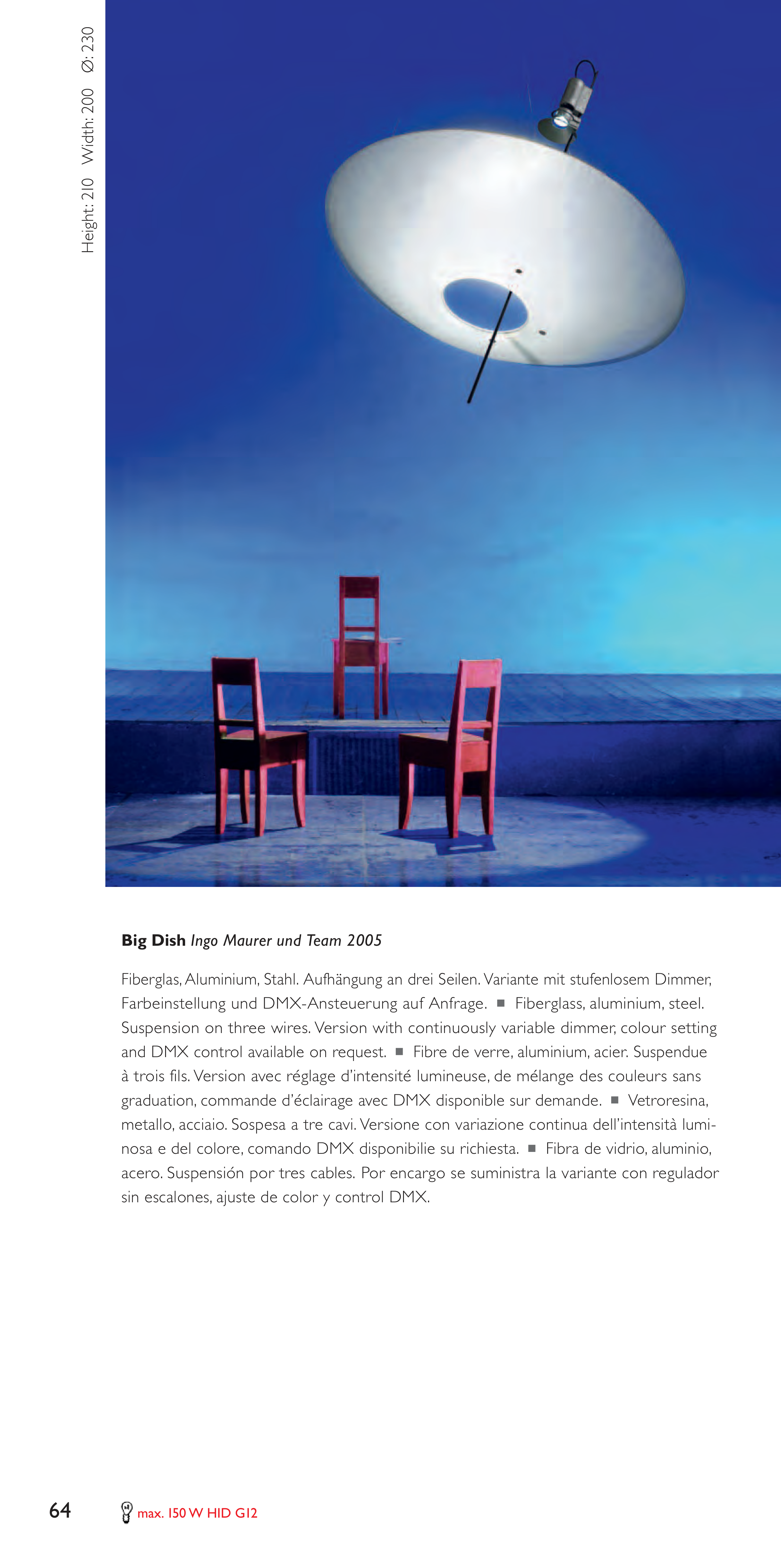 Fiberglas, Aluminium, Stahl. Aufhängung an drei Seilen. Variante mit stufenlosem Dimmer,