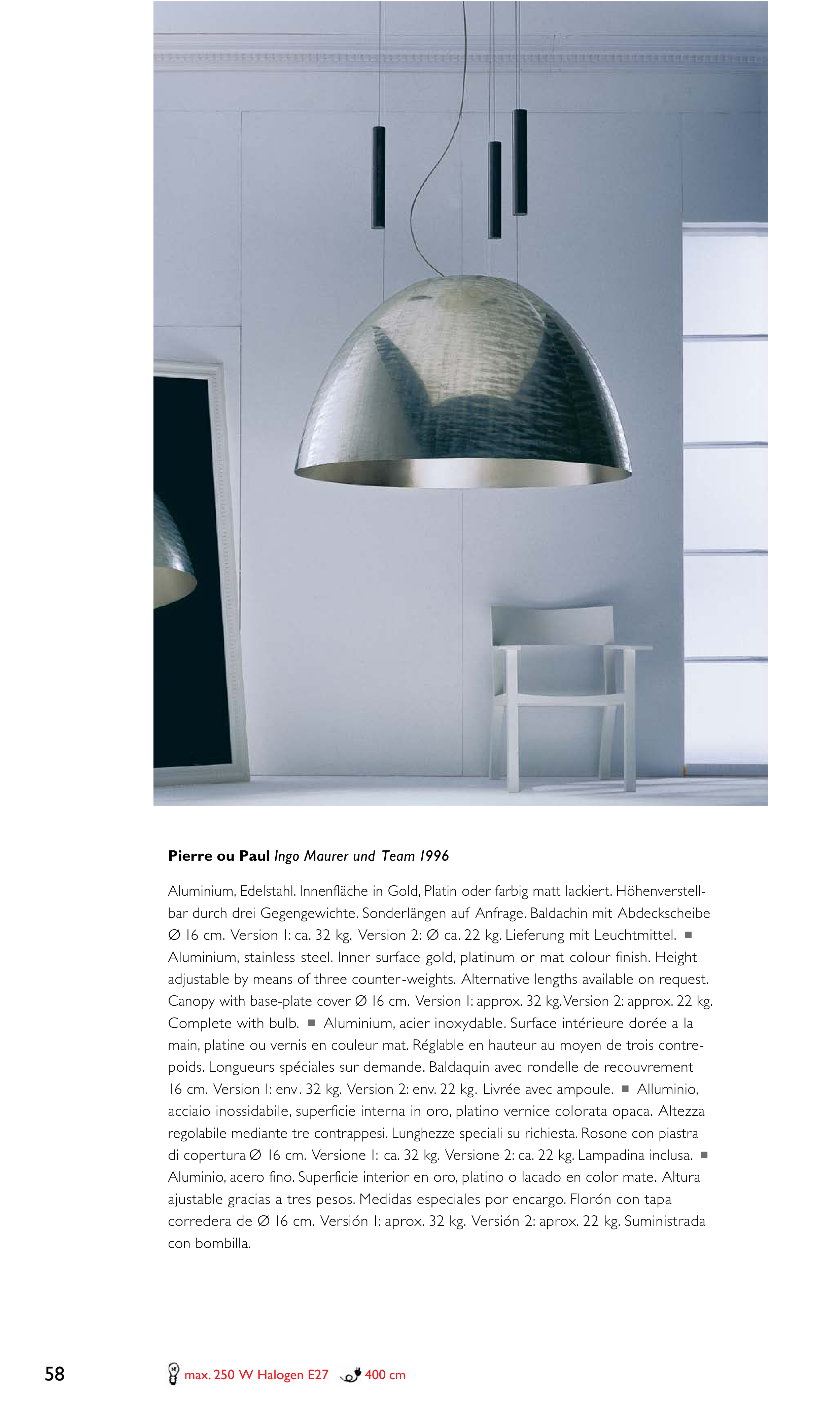 16 cm. Version 1: env. 32 kg. Version 2: env. 22 kg. Livrée avec ampoule. ! Alluminio,
