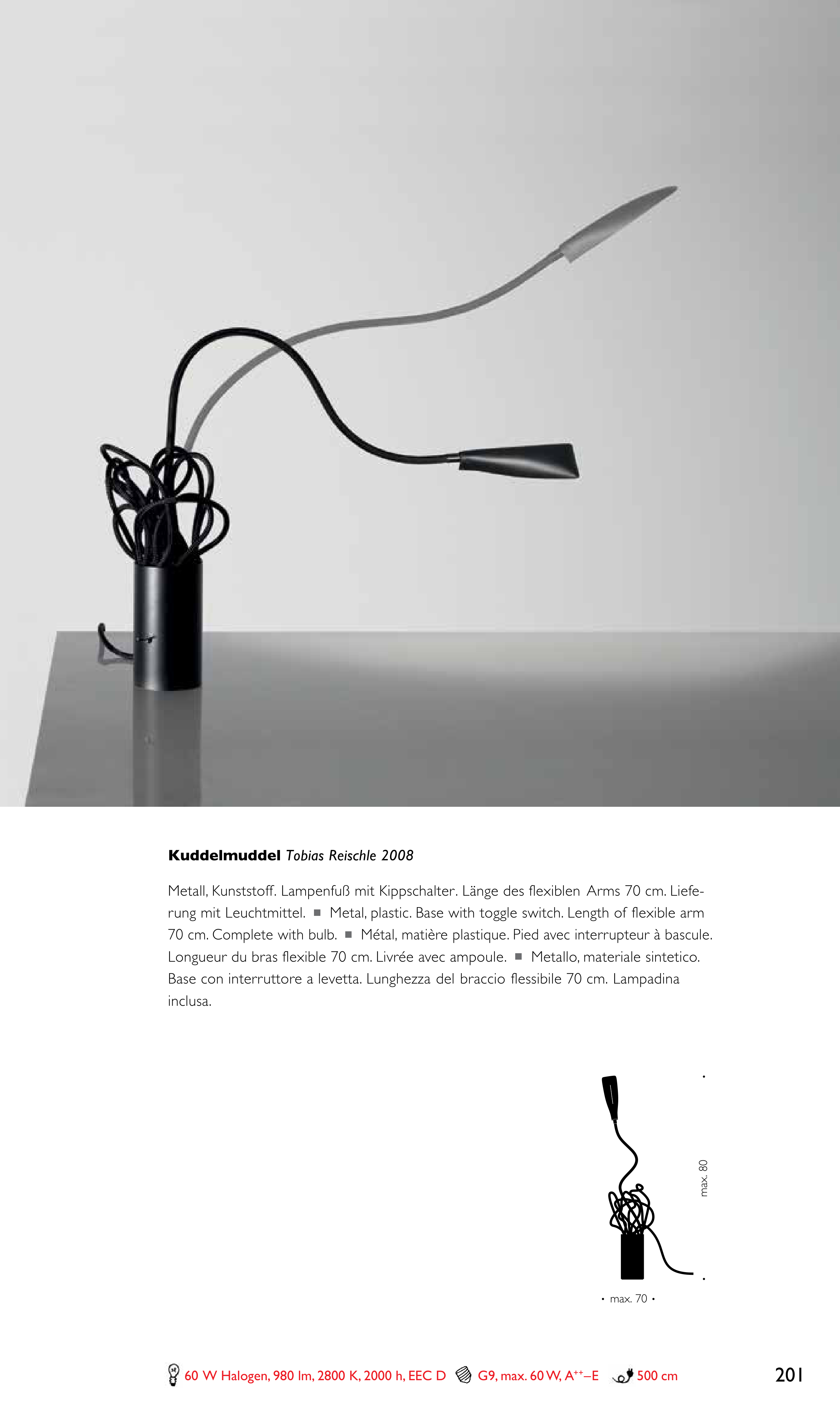 rung mit Leuchtmittel. n Metal, plastic. Base with toggle switch. Length of flexible arm