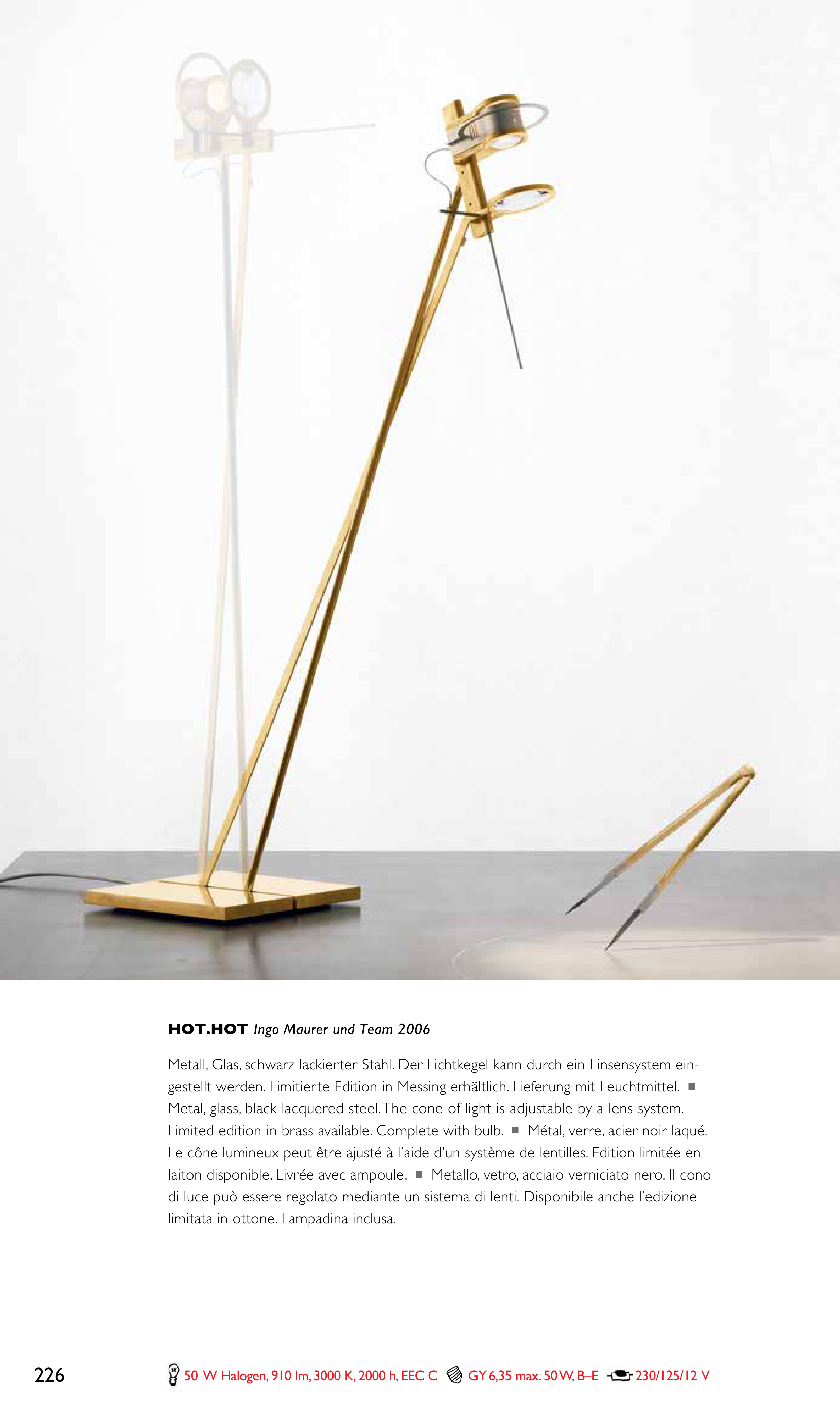 gestellt werden. Limitierte Edition in Messing erhältlich. Lieferung mit Leuchtmittel. n