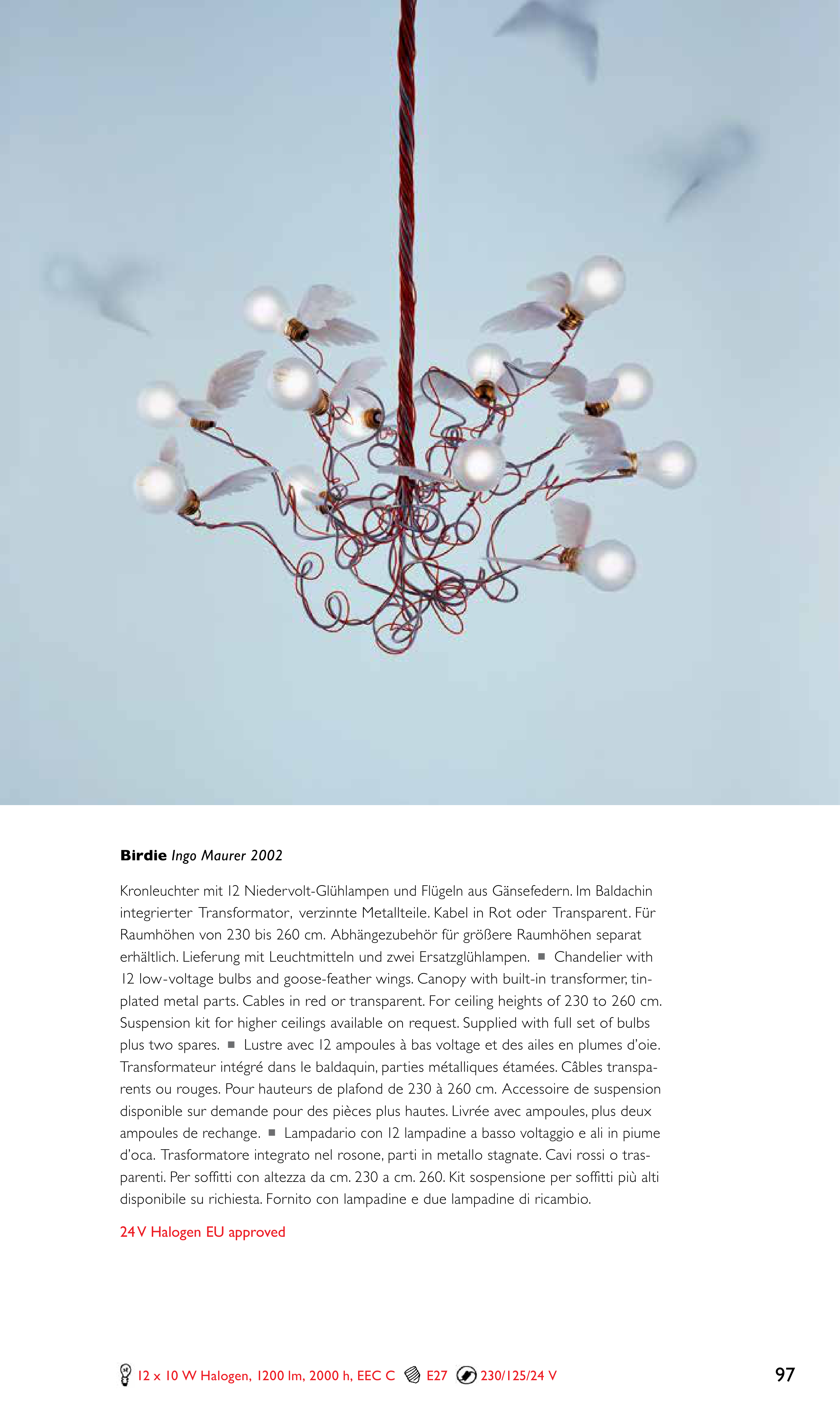 plated metal parts. Cables in red or transparent. For ceiling heights of 230 to 260 cm.