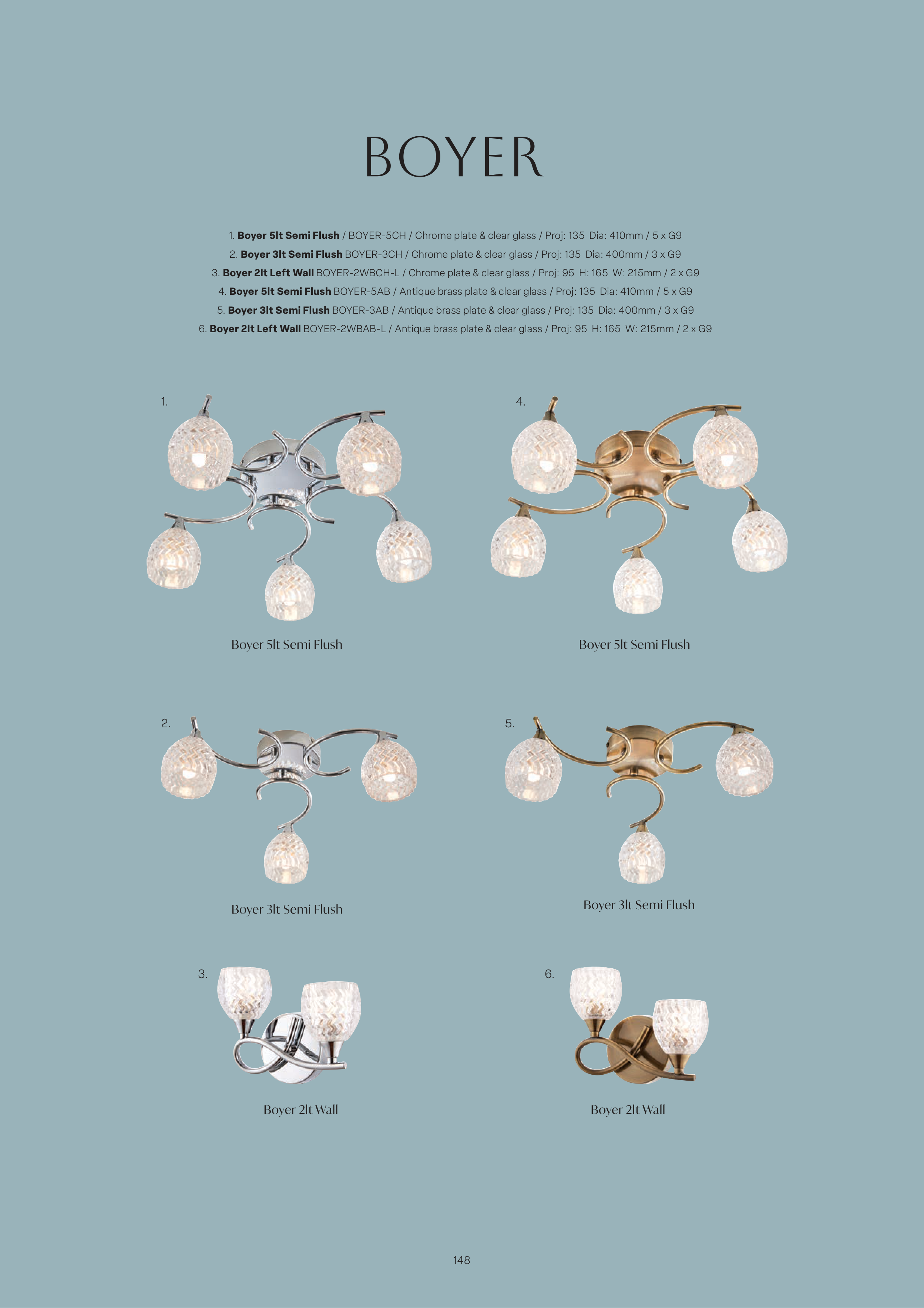 1. Boyer 5lt Semi Flush / BOYER-5CH / Chrome plate & clear glass / Proj: 135 Dia: 410mm / 5 x G9