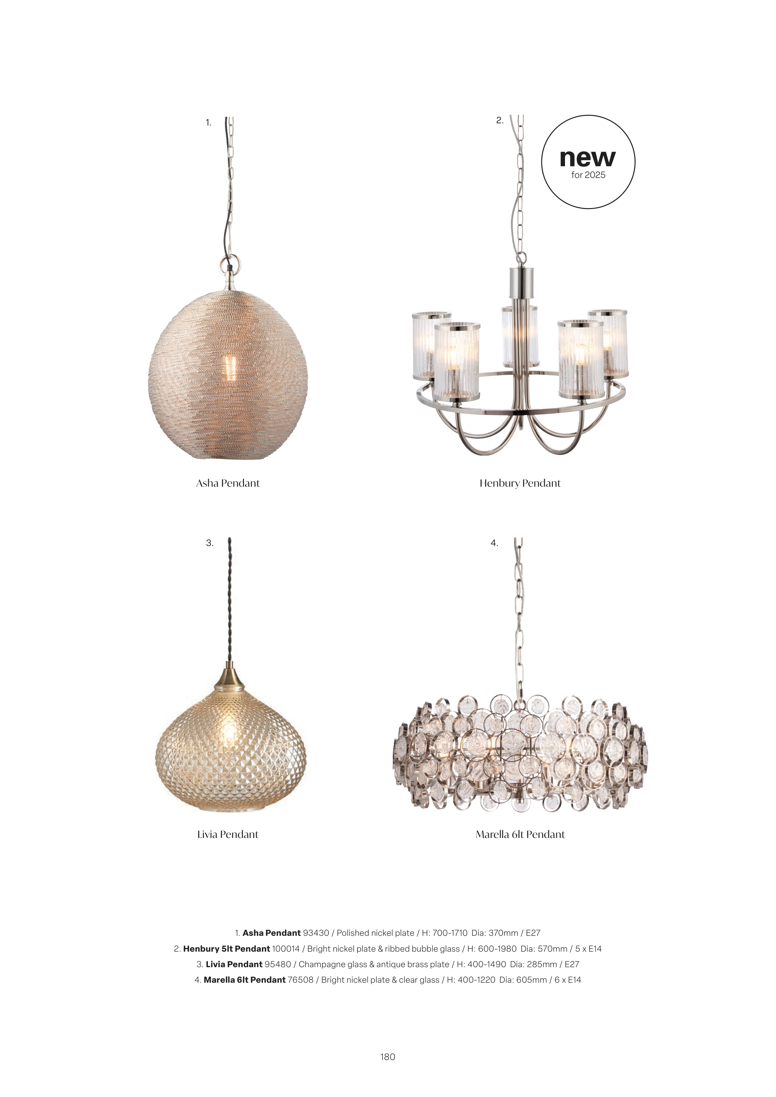 2. Henbury 5lt Pendant 100014 / Bright nickel plate & ribbed bubble glass / H: 600-1980 Dia: 570mm / 5 x E14