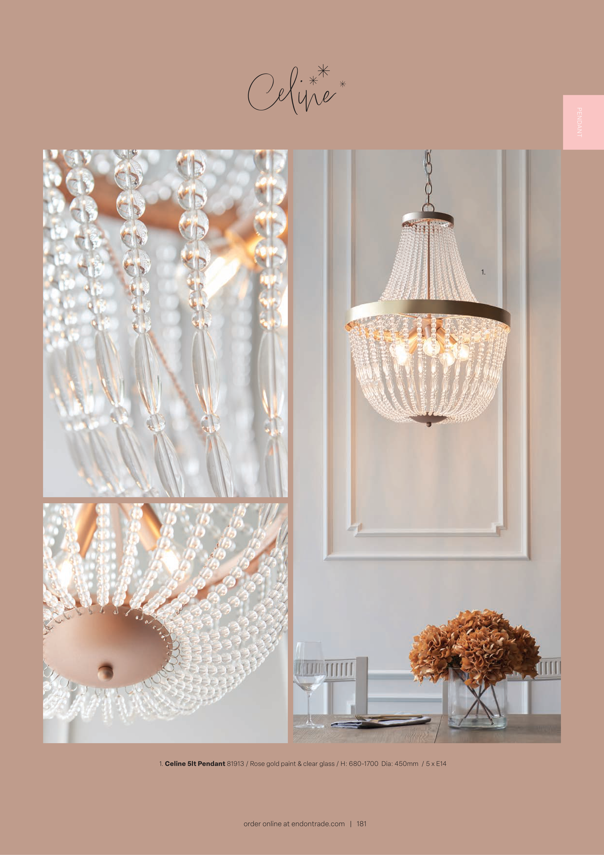 1. Celine 5lt Pendant 81913 / Rose gold paint & clear glass / H: 680-1700 Dia: 450mm / 5 x E14