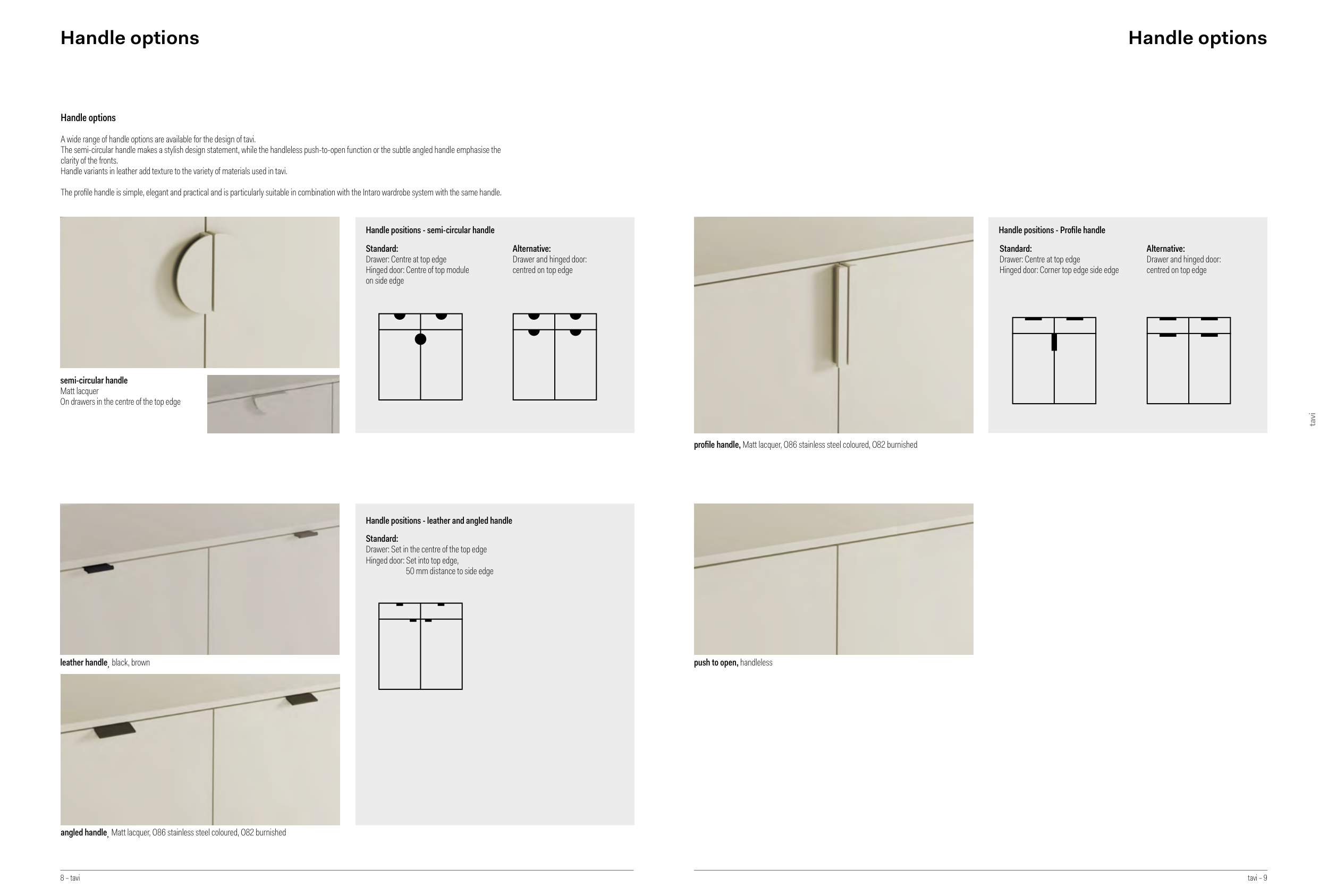The semi-circular handle makes a stylish design statement, while the handleless push-to-open function or the subtle angled handle emphasise the