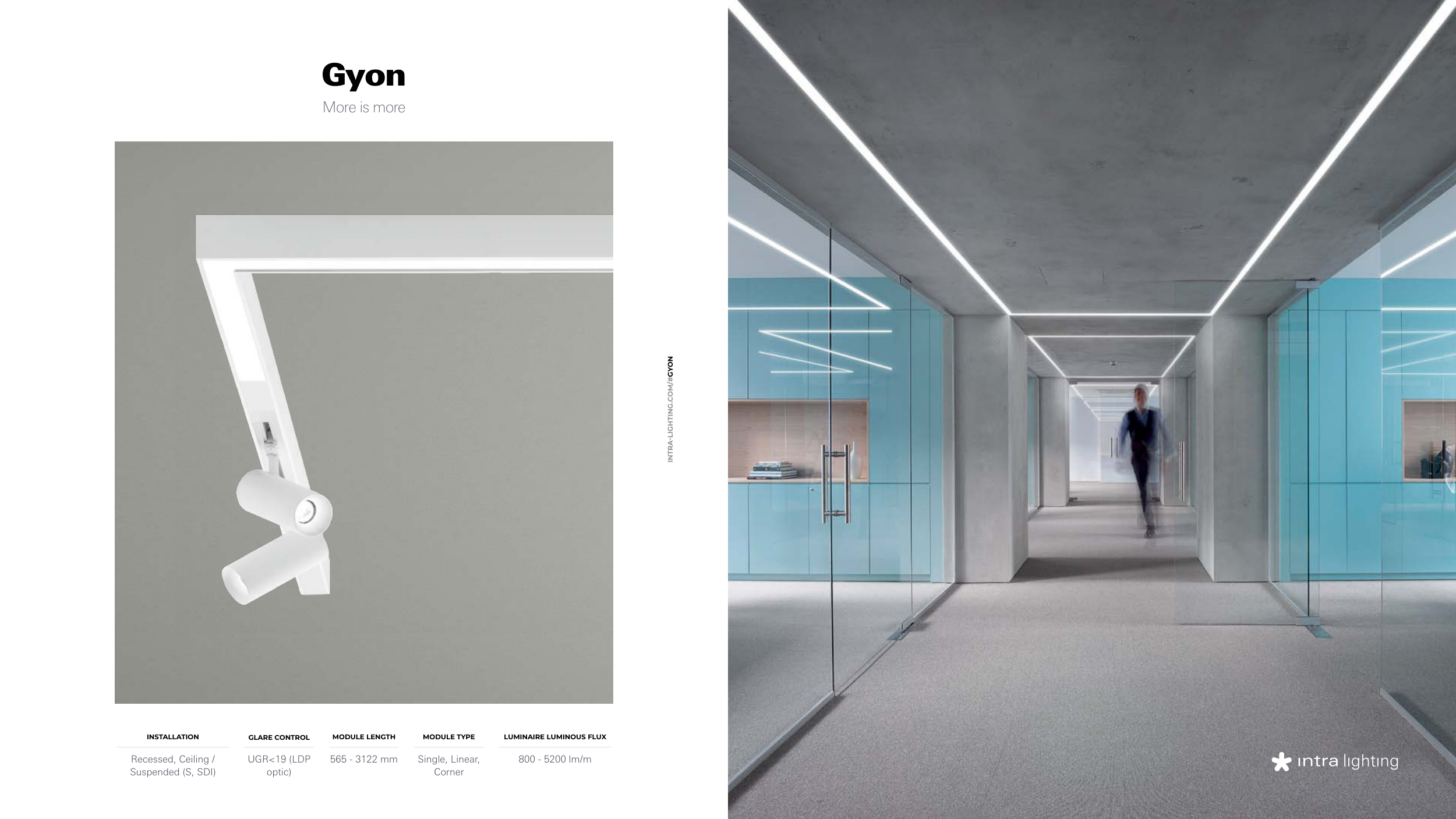 Gyon More is more INTRA-LIGHTING.COM/#GYON 800 - 5200 lm/m LUMINAIRE LUMINOUS FLUX Recessed, Ceiling / Suspended (S, SDI) INSTALLATION Single, Linear, Corner MODULE TYPE 565 - 3122 mm MODULE LENGTH UGR<19 (LDP optic) GLARE CONTROL EXPLORE EXPLORE BACK TO INDEX