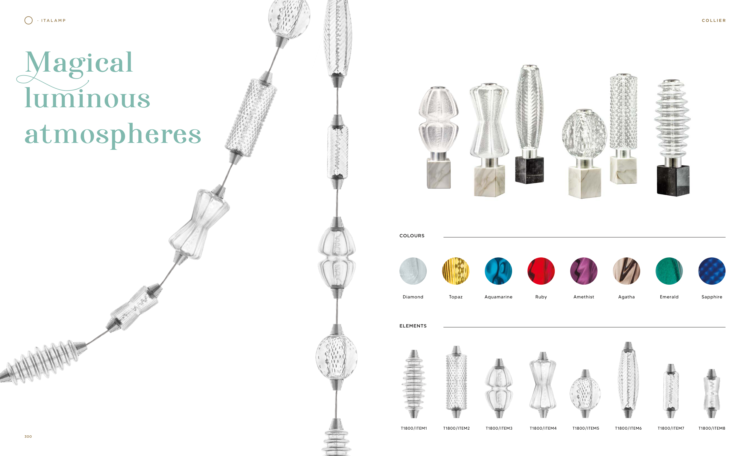 T1800/ITEM1 T1800/ITEM2 T1800/ITEM3 T1800/ITEM4 T1800/ITEM5 T1800/ITEM6 T1800/ITEM7 T1800/ITEM8 C O L L I E R Magical luminous atmospheres Diamond Topaz Aquamarine Ruby Amethist Agatha Emerald Sapphire · I TA L A M P C O L L I E R ELEMENTS COLOURS 300