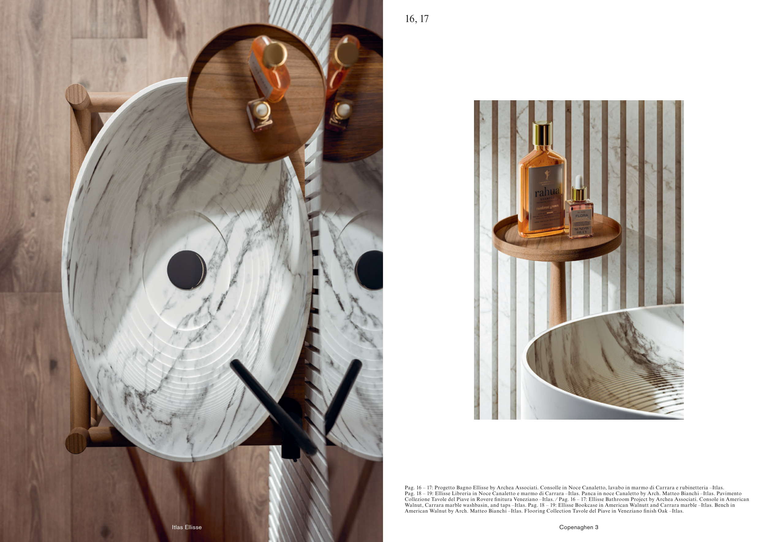 Pag. 16 – 17: Progetto Bagno Ellisse by Archea Associati. Consolle in Noce Canaletto, lavabo in marmo di Carrara e rubinetteria –Itlas.