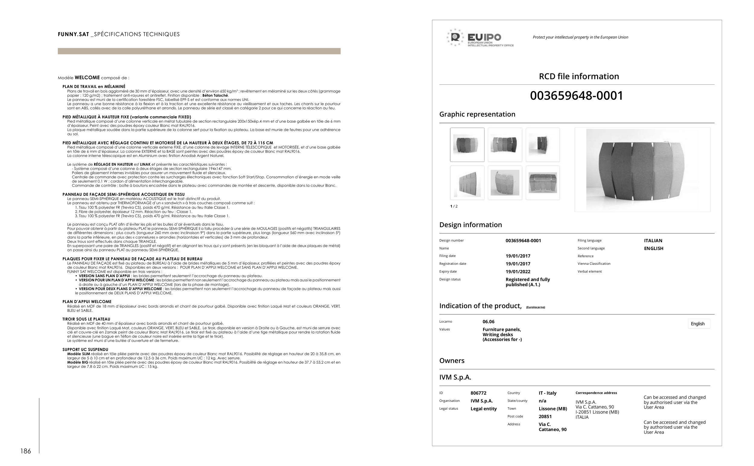 1. Tissu 100 % polyester FR (Trevira CS), poids 470 g/ml. Résistance au feu Italie Classe 1.