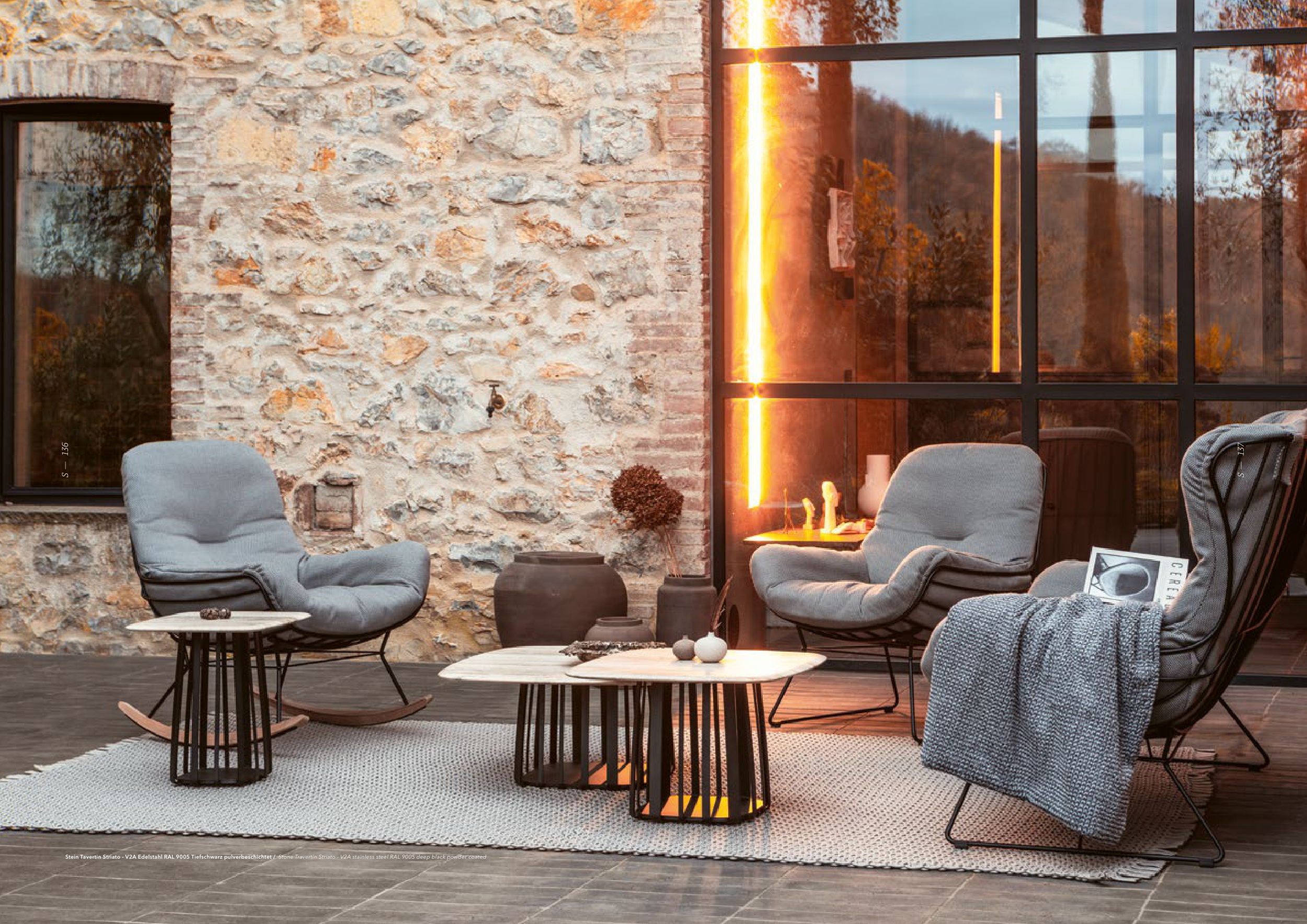 Stein Tavertin Striato - V2A Edelstahl RAL 9005 Tiefschwarz pulverbeschichtet / Stone Travertin Striato - V2A stainless steel RAL 9005 deep black powder coated