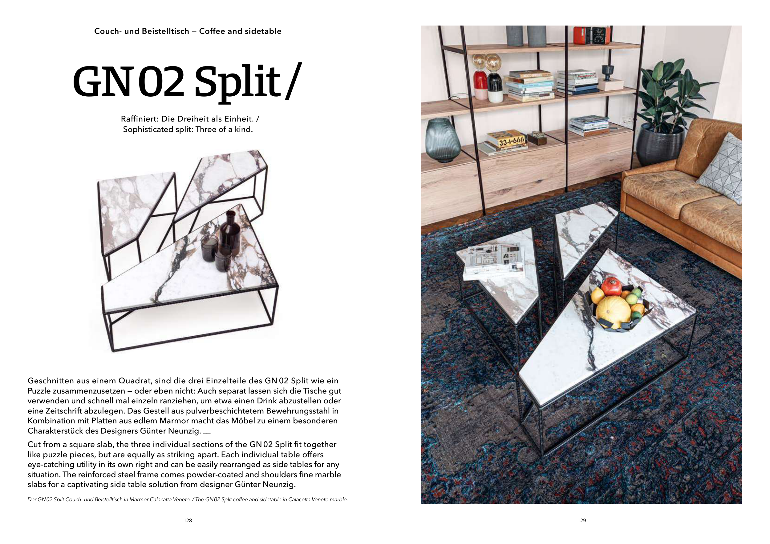 Der GN 02 Split Couch- und Beistelltisch in Marmor Calacatta Veneto. / The GN 02 Split coffee and sidetable in Calacetta Veneto marble.
