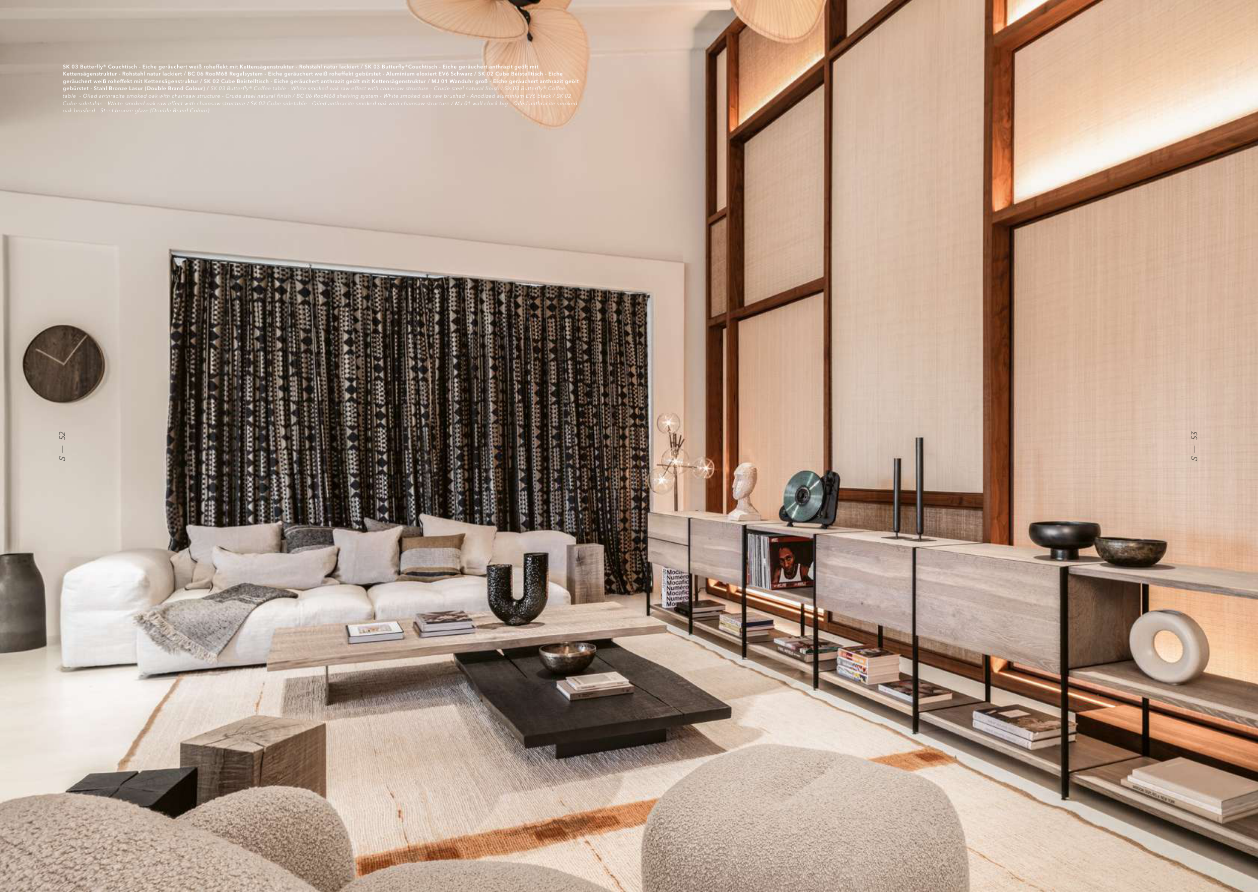 table - Oiled anthracite smoked oak with chainsaw structure - Crude steel natural finish / BC 06 RooM68 shelving system - White smoked oak raw brushed - Anodized aluminium EV6 black / SK 02
