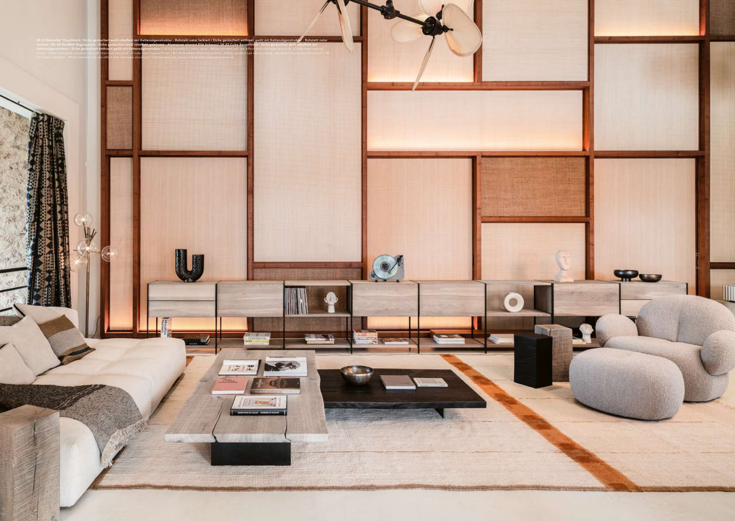 finish / Oiled anthracite smoked oak with chainsaw structure - Crude steel natural finish / BC 06 RooM68 Shelving system - White smoked oak raw brushed - Anodized aluminium EV6 black / SK