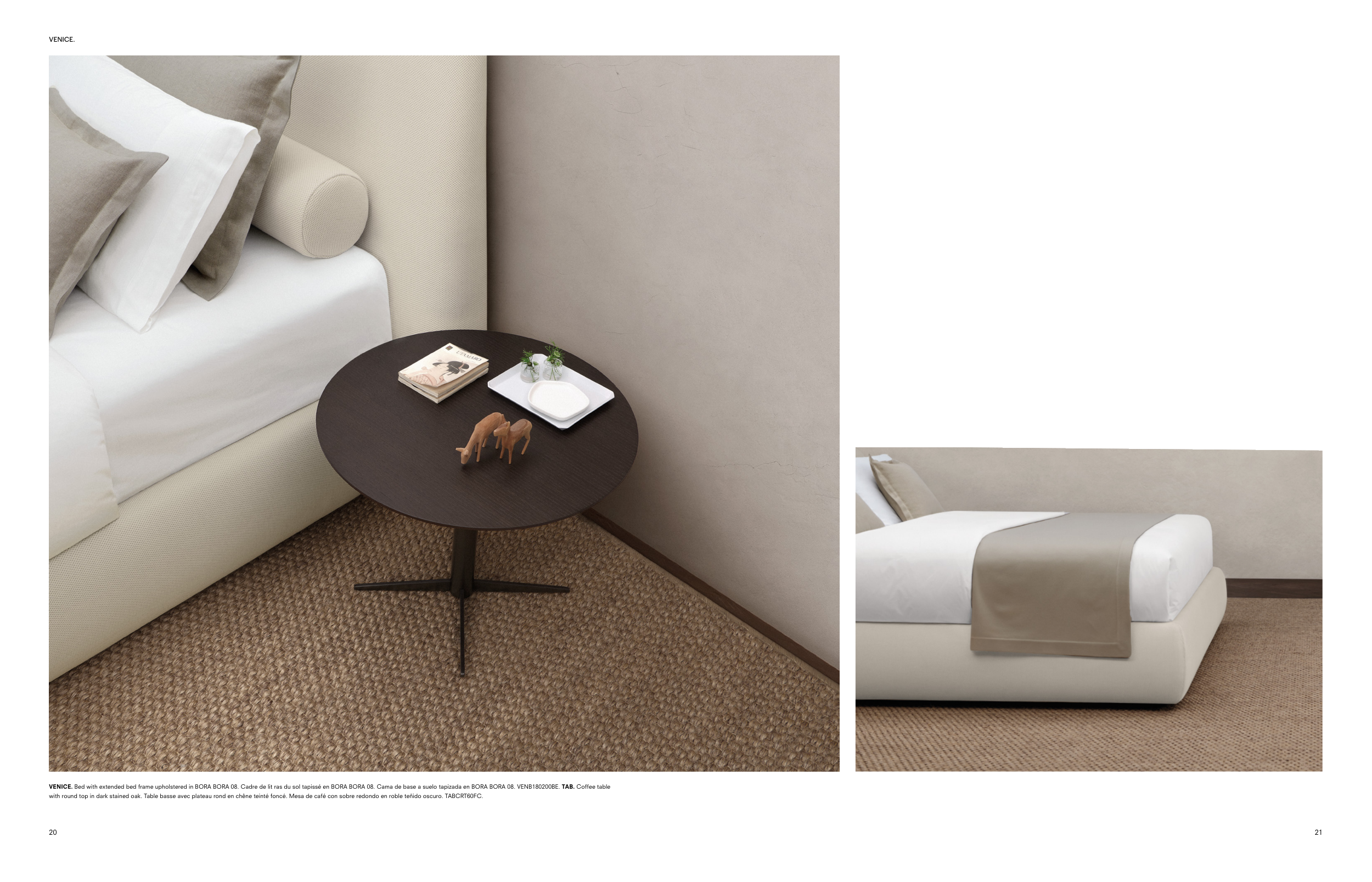 VENICE. Bed with extended bed frame upholstered in BORA BORA 08. Cadre de lit ras du sol tapissé en BORA BORA 08. Cama de base a suelo tapizada en BORA BORA 08. VENB180200BE. TAB. Coffee table