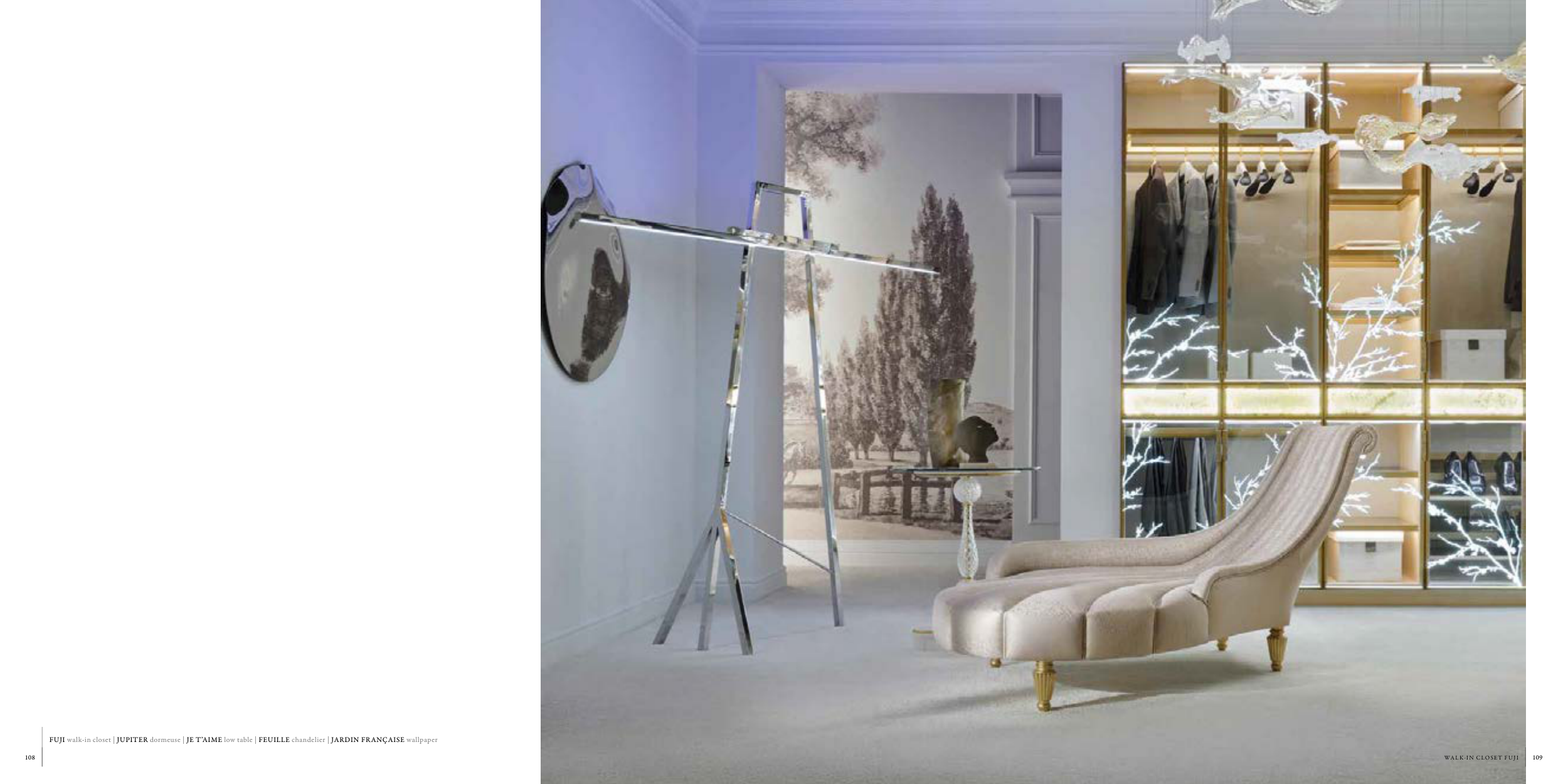 FUJI walk-in closet | JUPITER dormeuse | JE T’AIME low table | FEUILLE chandelier | JARDIN FRANÇAISE wallpaper