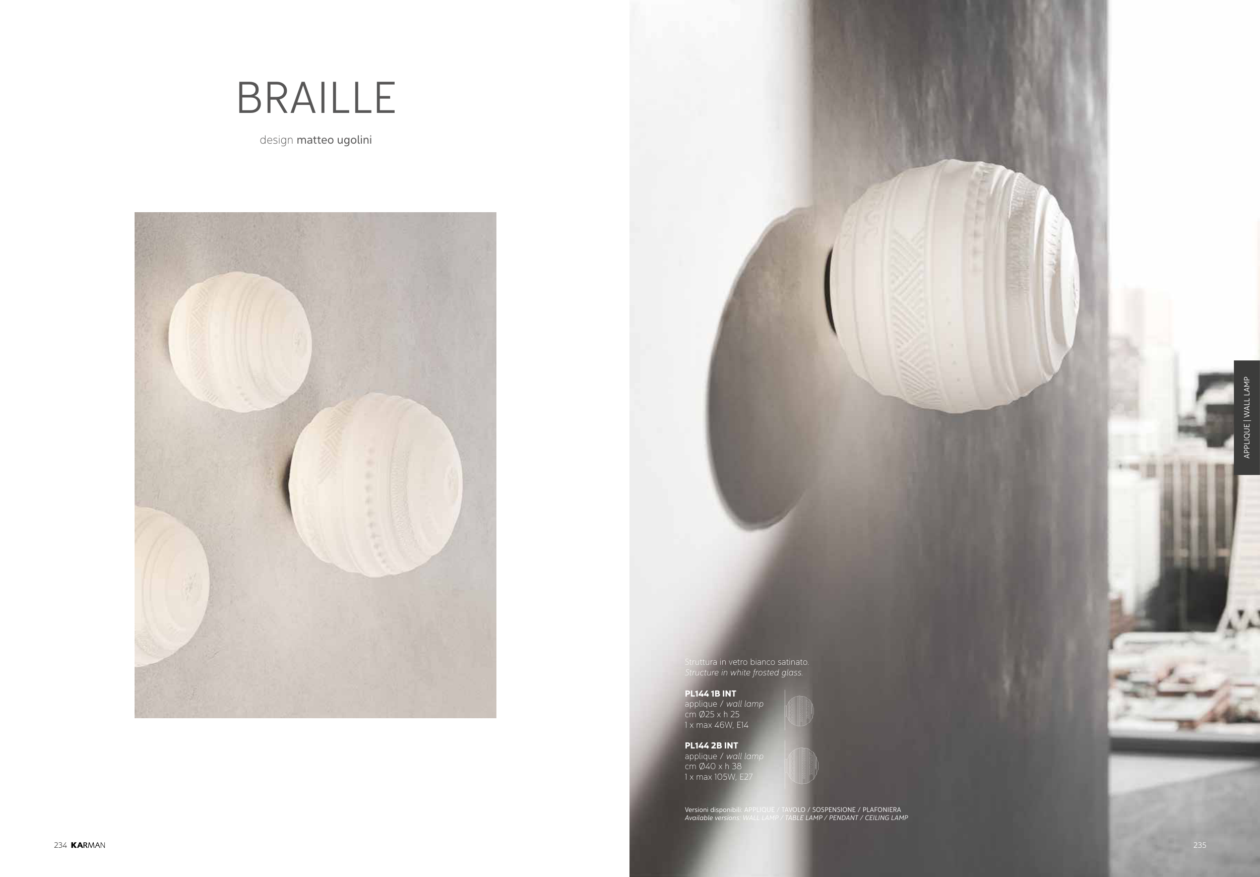 Versioni disponibili: APPLIQUE / TAVOLO / SOSPENSIONE / PLAFONIERA
