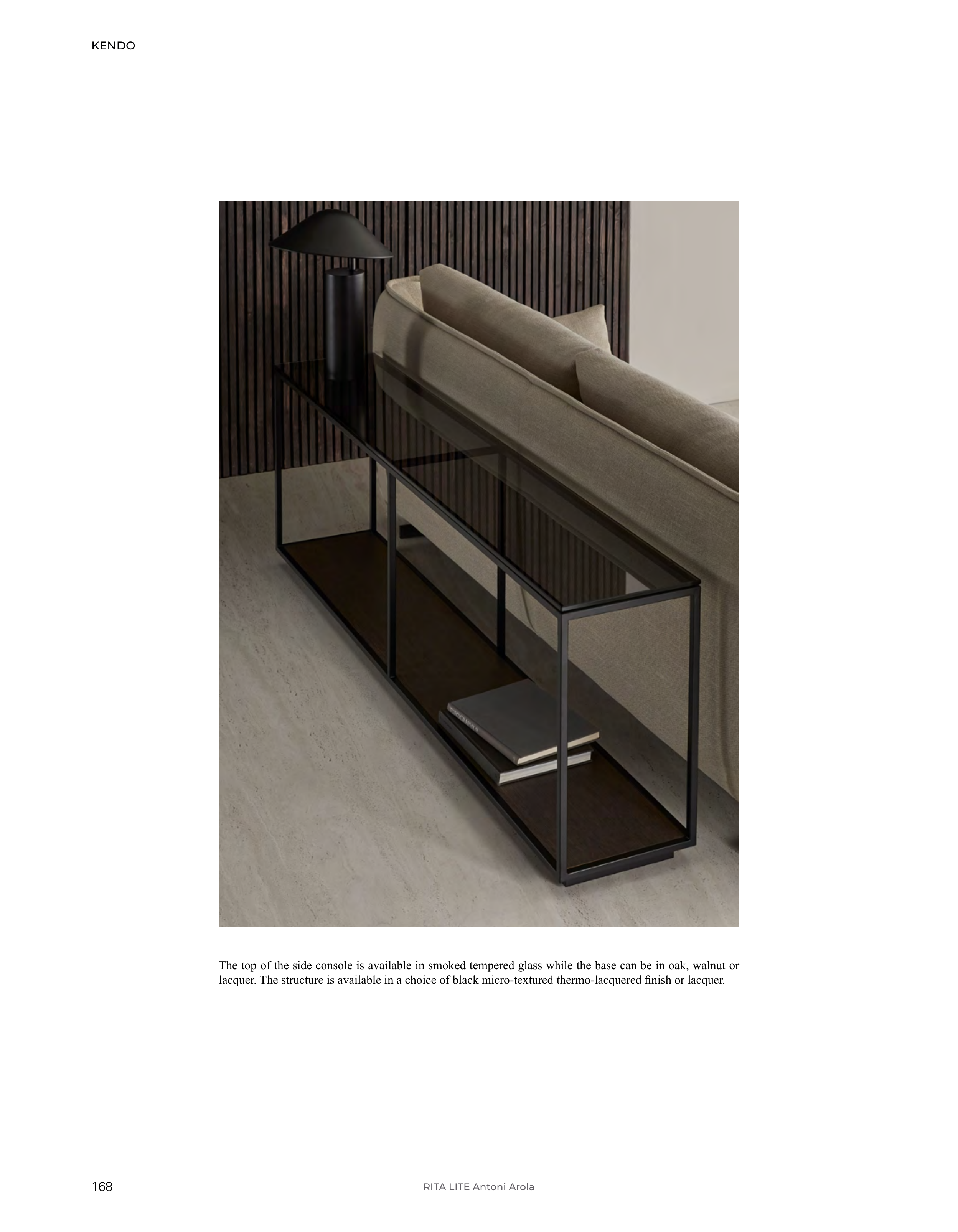 The top of the side console is available in smoked tempered glass while the base can be in oak, walnut or