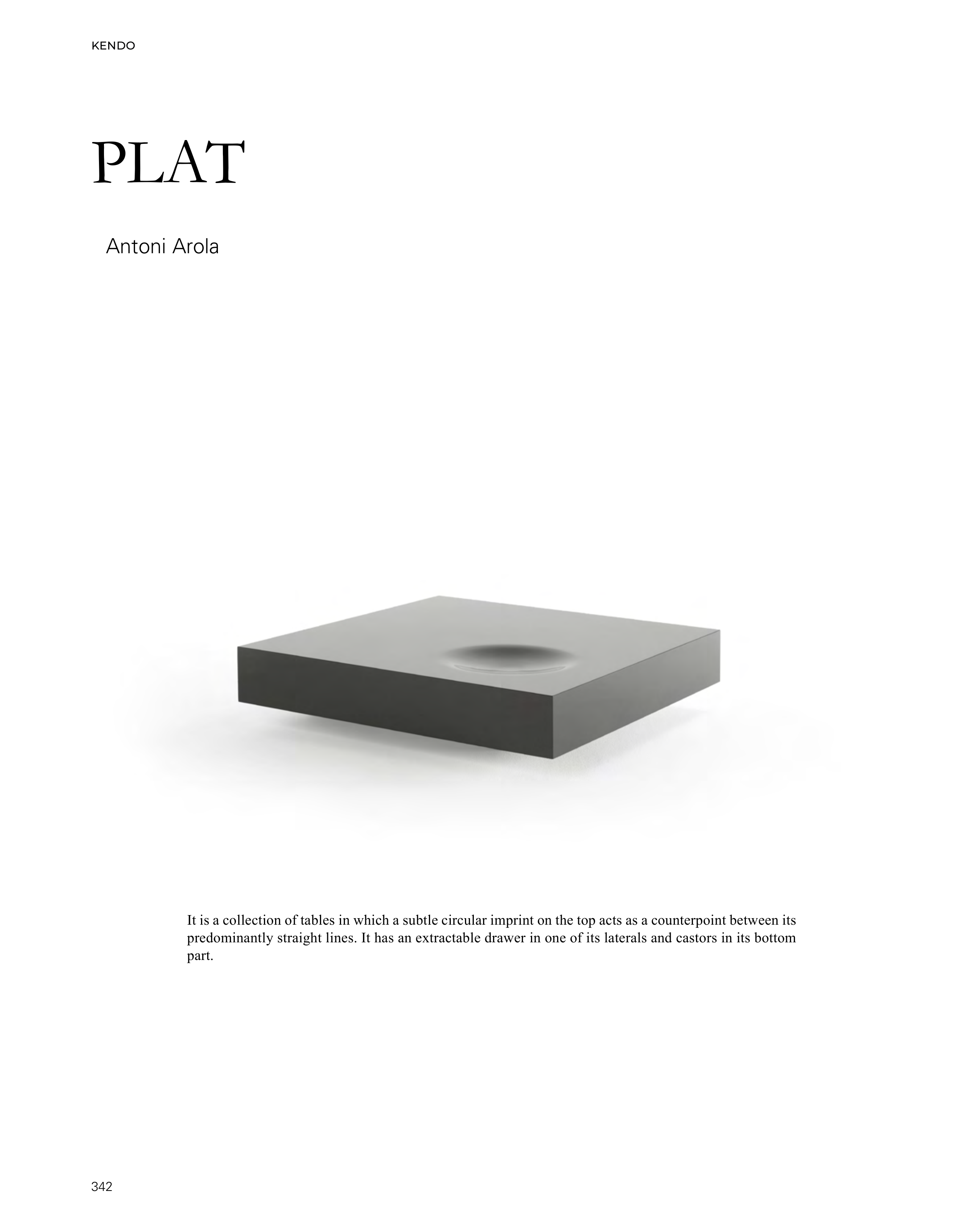 KENDO 342 Antoni Arola It is a collection of tables in which a subtle circular imprint on the top acts as a counterpoint between its predominantly straight lines. It has an extractable drawer in one of its laterals and castors in its bottom part. PLAT