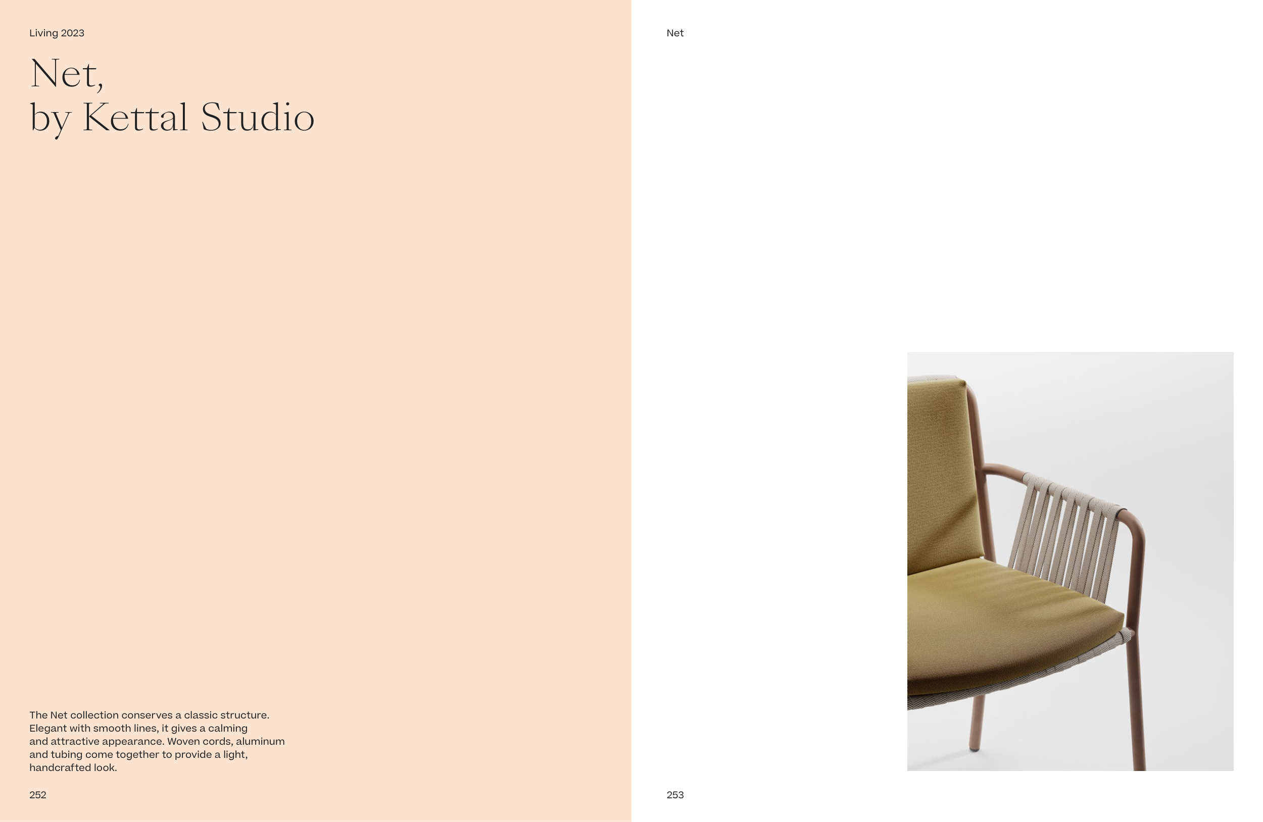 The Net collection conserves a classic structure. Elegant with smooth lines, it gives a calming and attractive appearance. Woven cords, aluminum and tubing come together to provide a light, handcrafted look. 252 253 Net, by Kettal Studio Net Living 2023