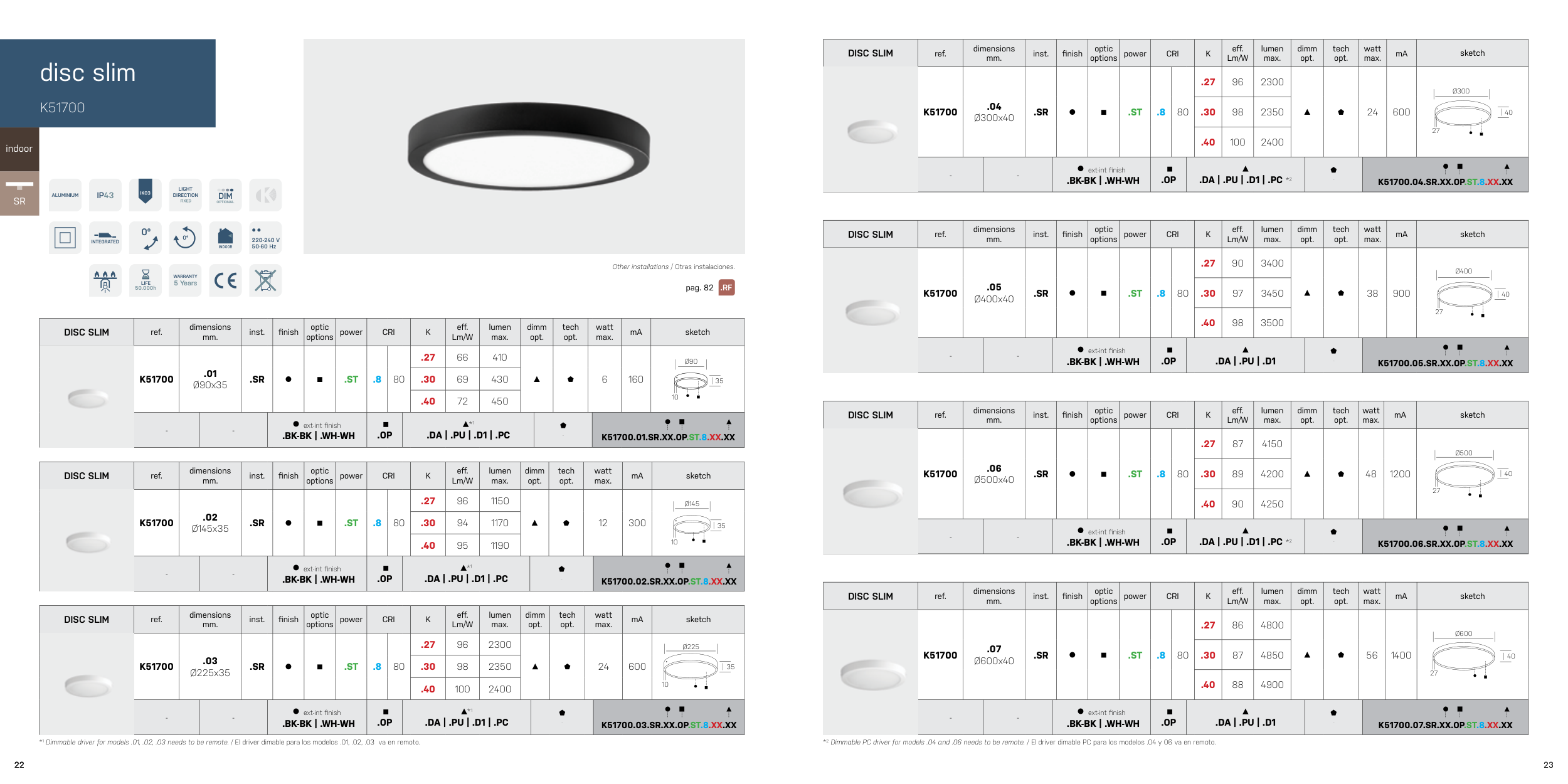 *1 Dimmable driver for models .01, .02, .03 needs to be remote. / El driver dimable para los modelos .01, .02, .03 va en remoto.