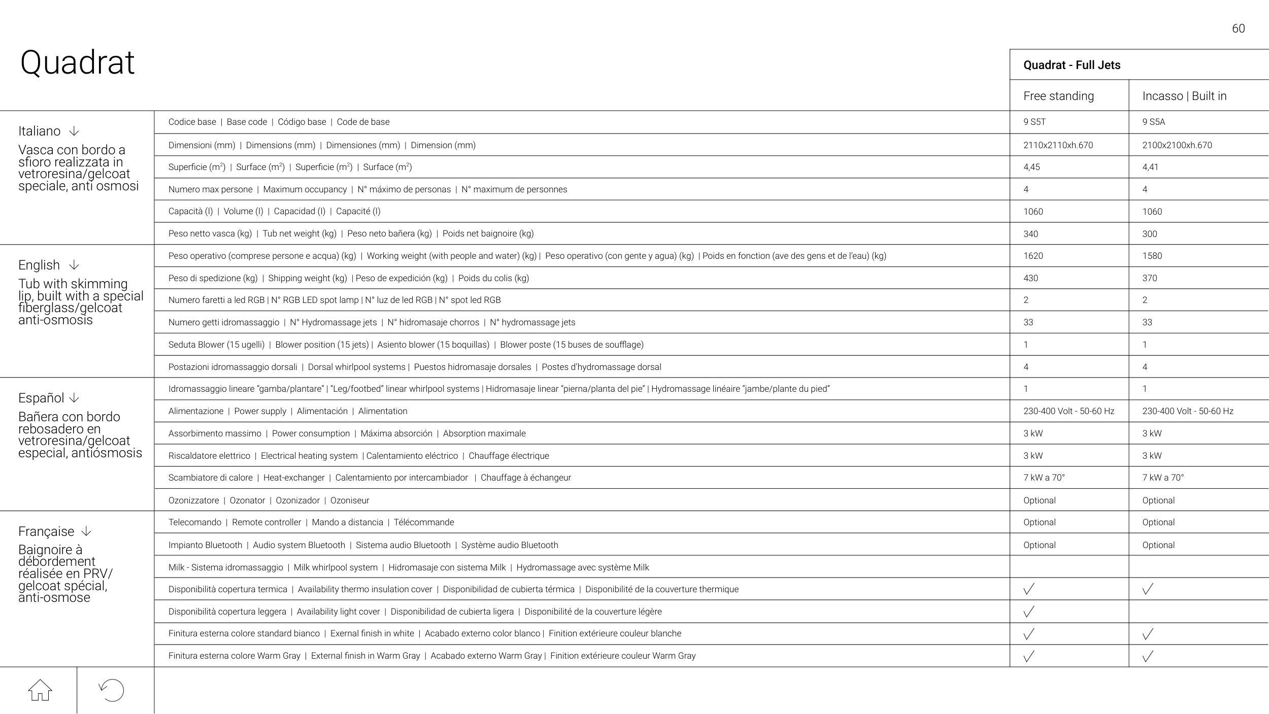 Peso netto vasca (kg) | Tub net weight (kg) | Peso neto bañera (kg) | Poids net baignoire (kg)