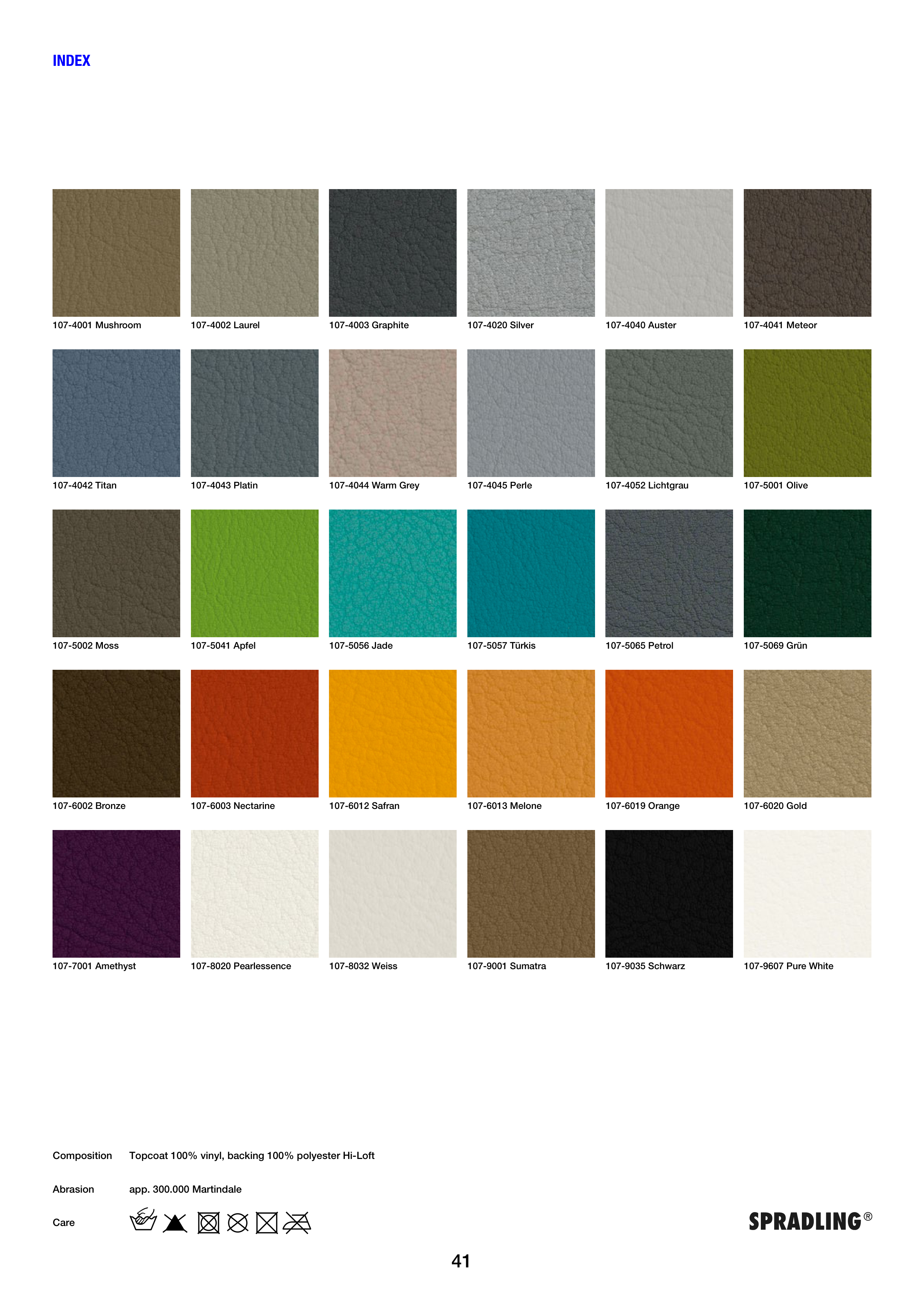 Topcoat 100% vinyl, backing 100% polyester Hi-Loft