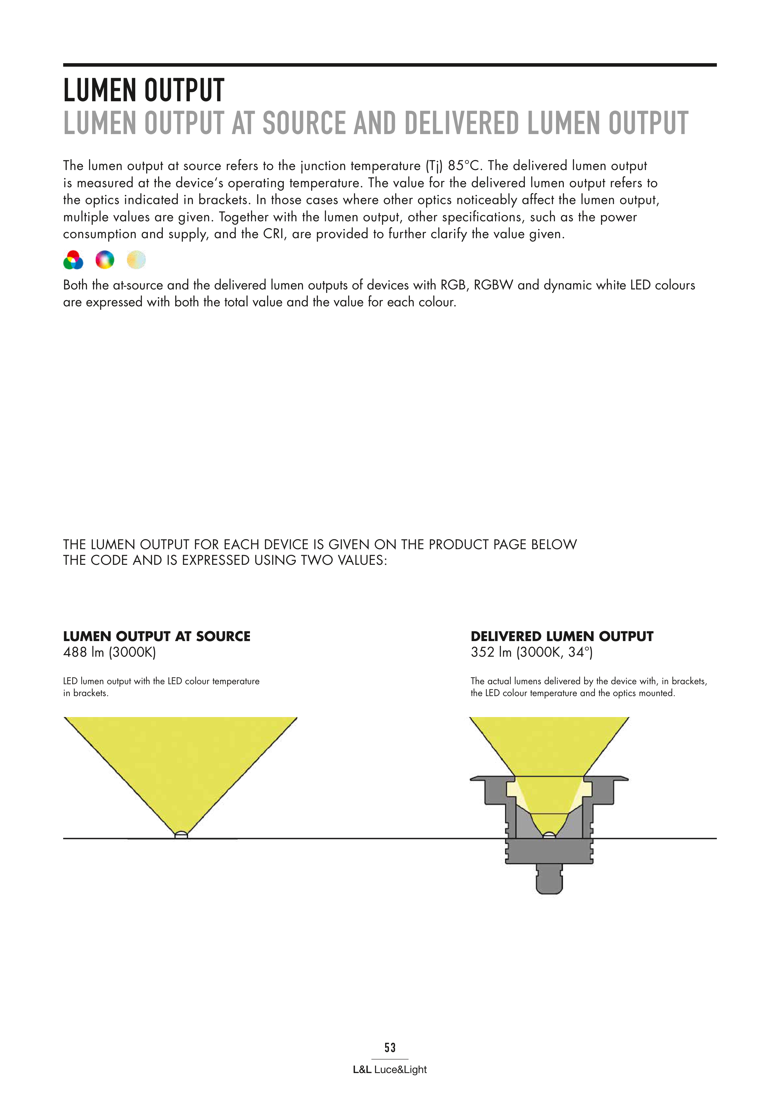 Both the at-source and the delivered lumen outputs of devices with RGB, RGBW and dynamic white LED colours