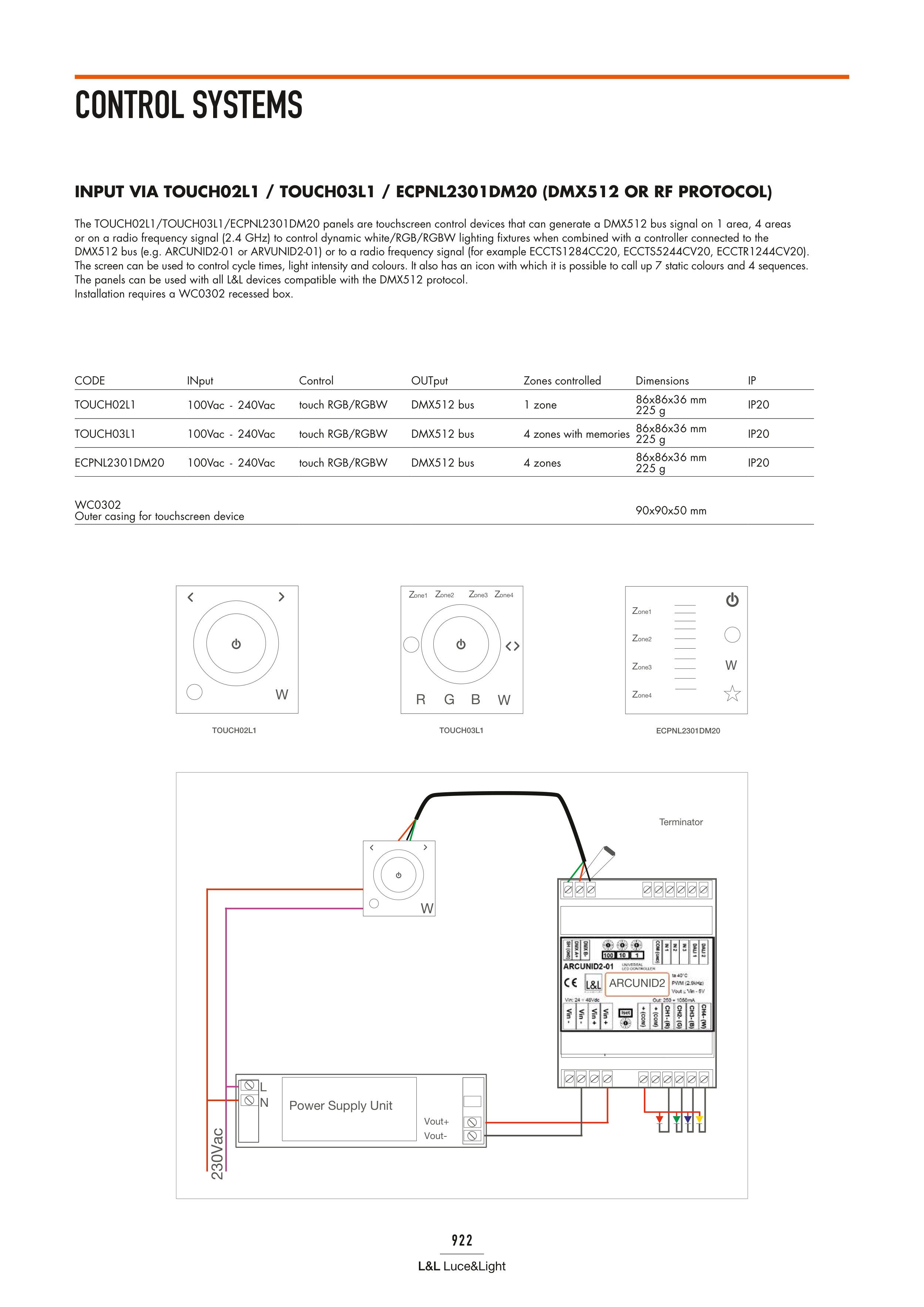 The TOUCH02L1/TOUCH03L1/ECPNL2301DM20 panels are touchscreen control devices that can generate a DMX512 bus signal on 1 area, 4 areas