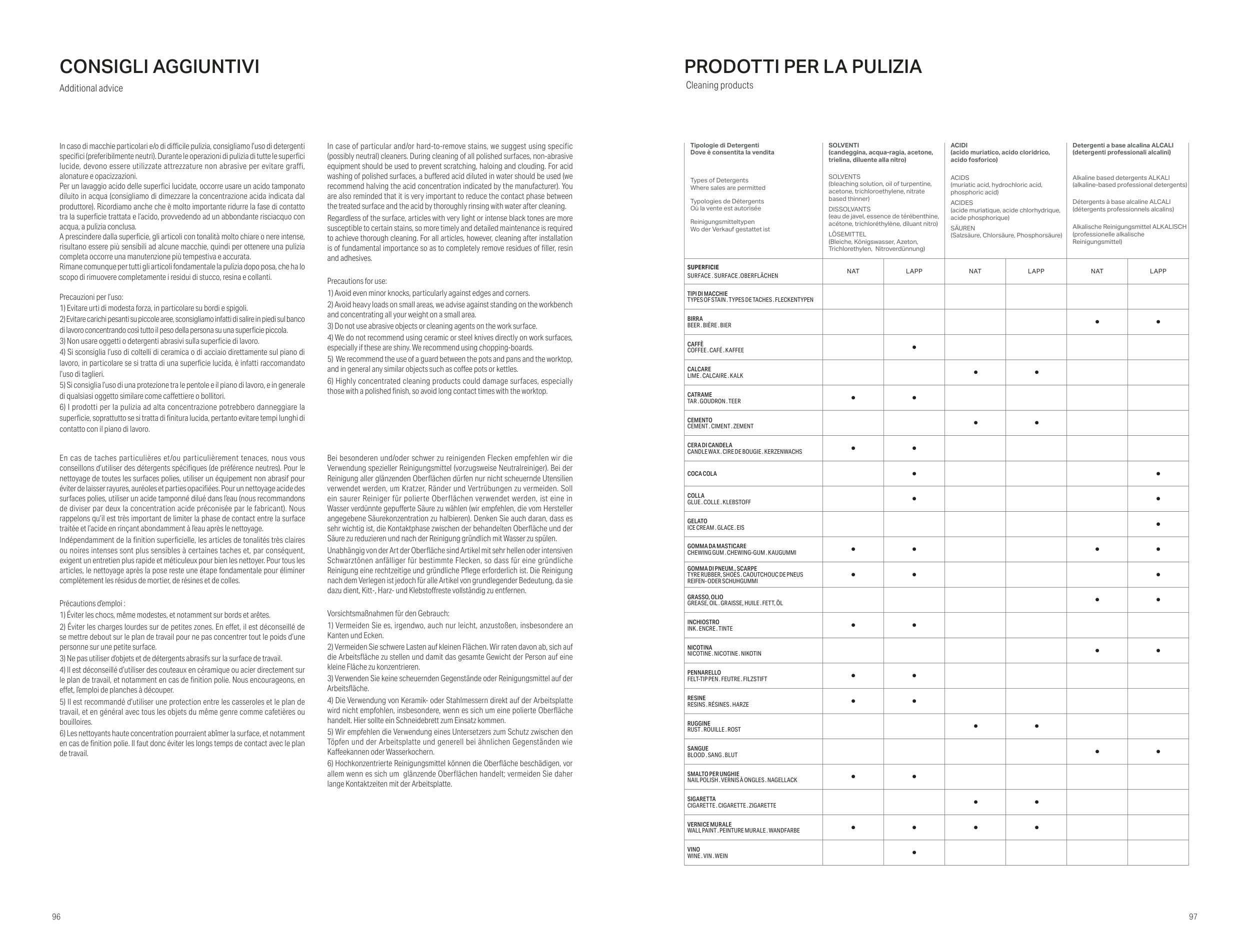 In caso di macchie particolari e/o di difficile pulizia, consigliamo l’uso di detergenti