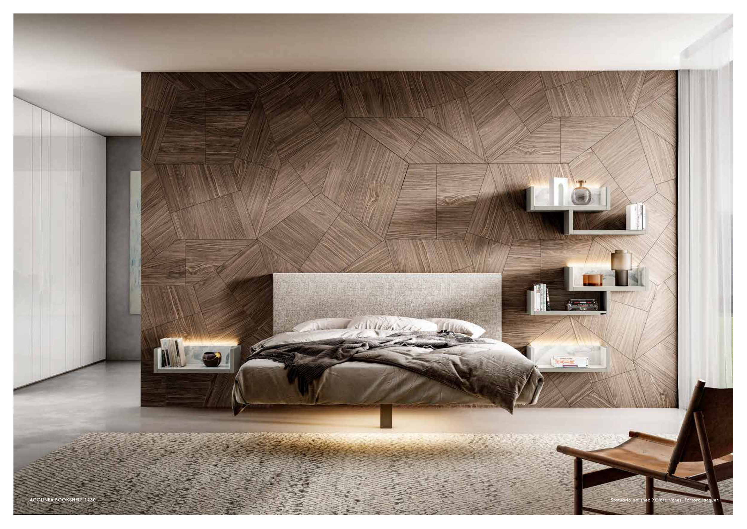Statuario polished XGlass niches. Tortora lacquer.