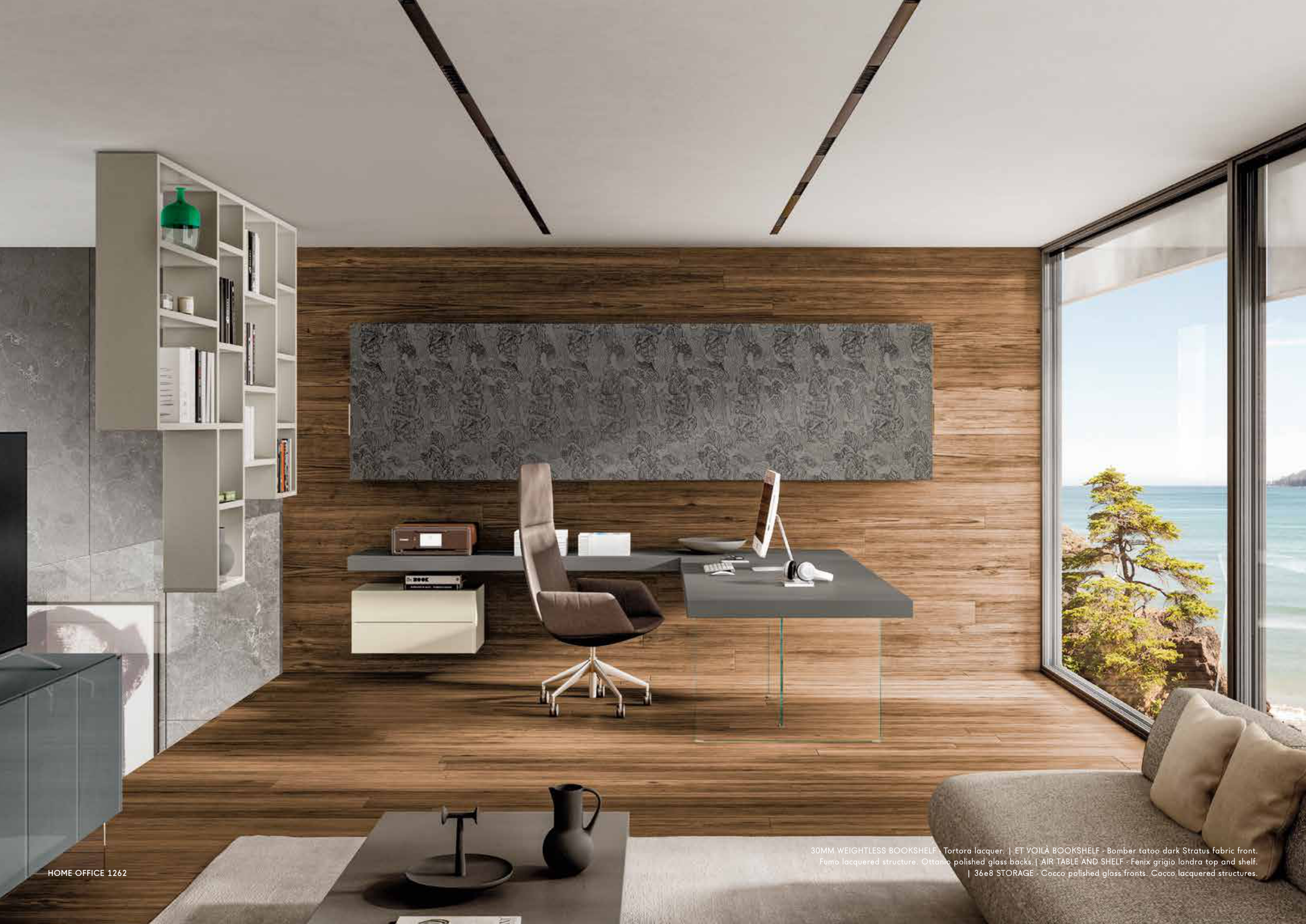 Fumo lacquered structure. Ottanio polished glass backs.| AIR TABLE AND SHELF - Fenix grigio londra top and shelf.
