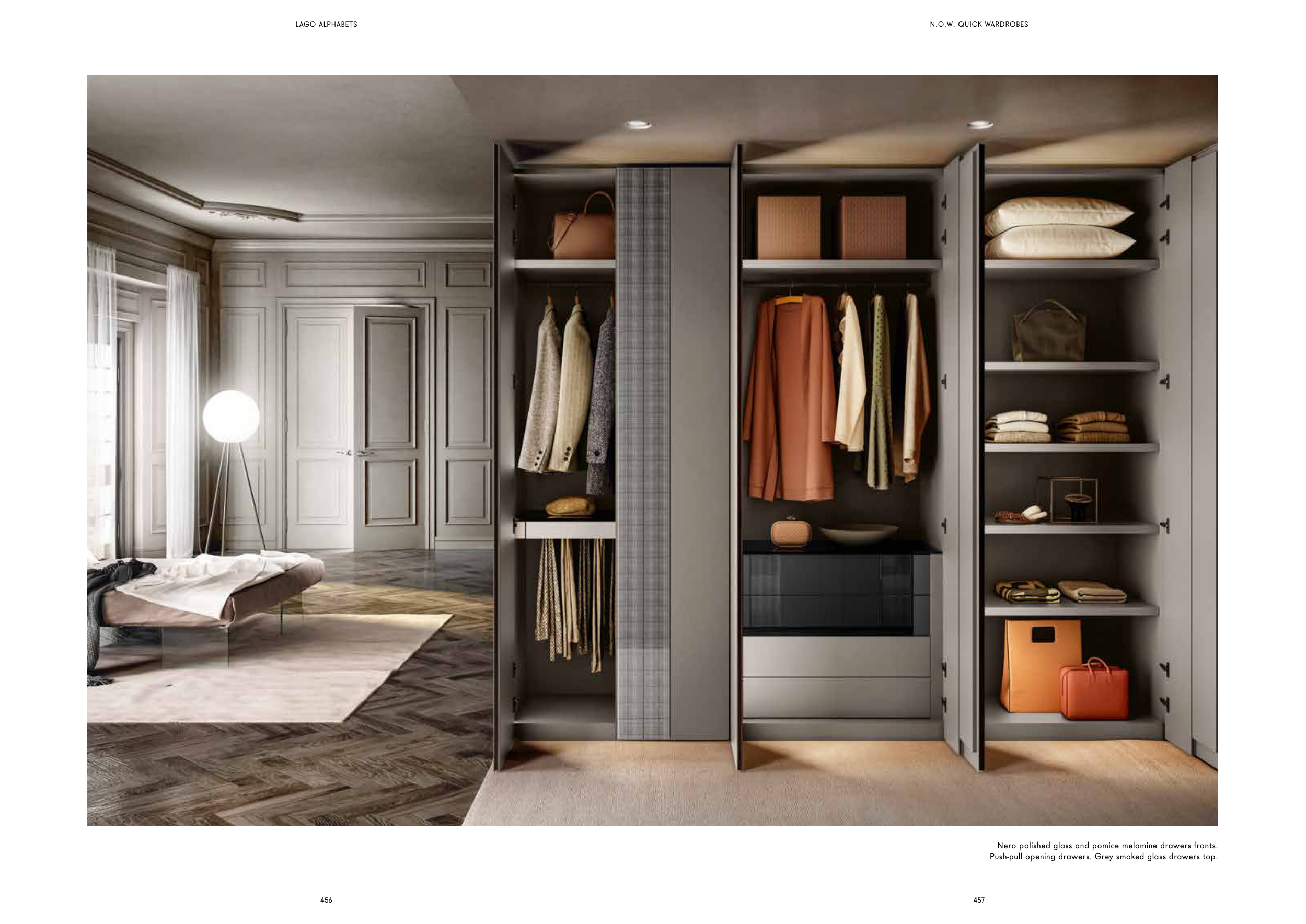 Nero polished glass and pomice melamine drawers fronts.