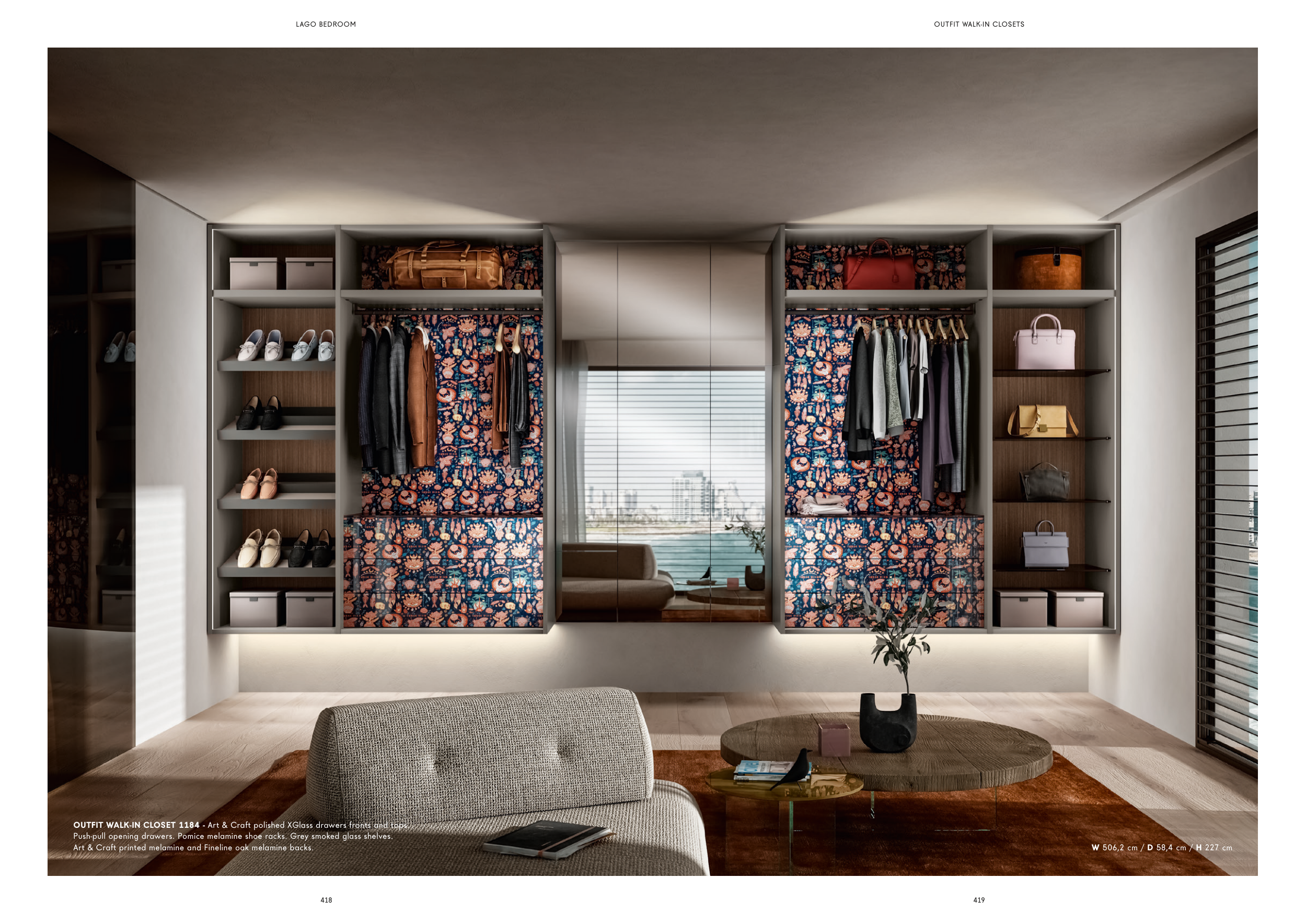 Push-pull opening drawers. Pomice melamine shoe racks. Grey smoked glass shelves.
