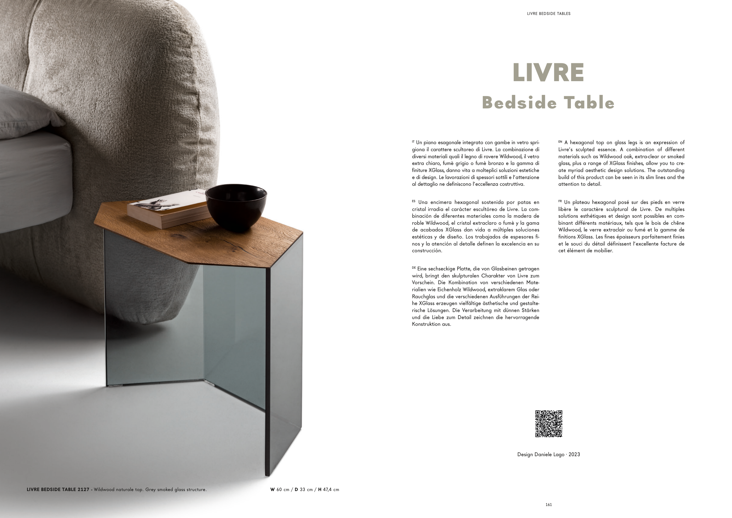 LIVRE BEDSIDE TABLE 2127 - Wildwood naturale top. Grey smoked glass structure.