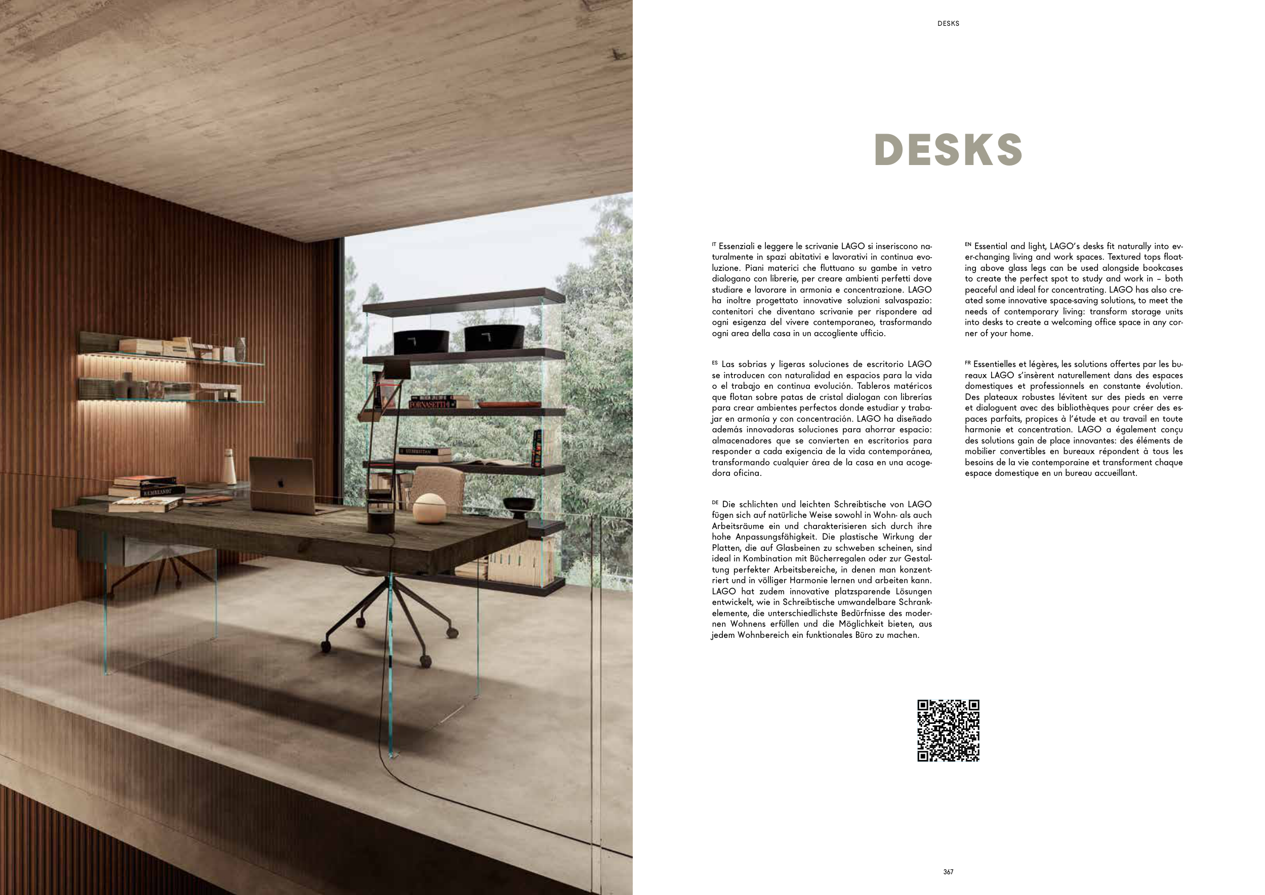 EN Essential and light, LAGO’s desks fit naturally into ev-