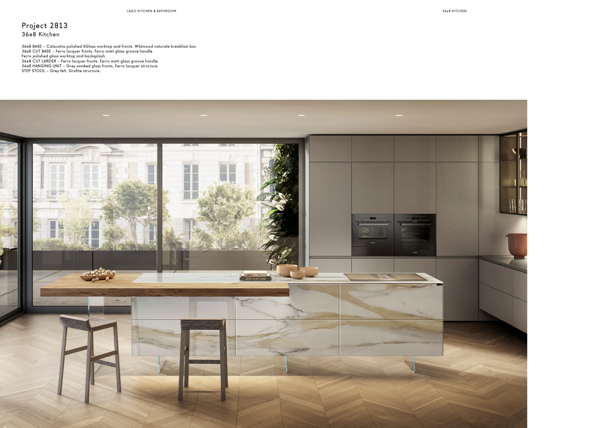 36e8 BASE – Calacatta polished XGlass worktop and fronts. Wildwood naturale breakfast bar.