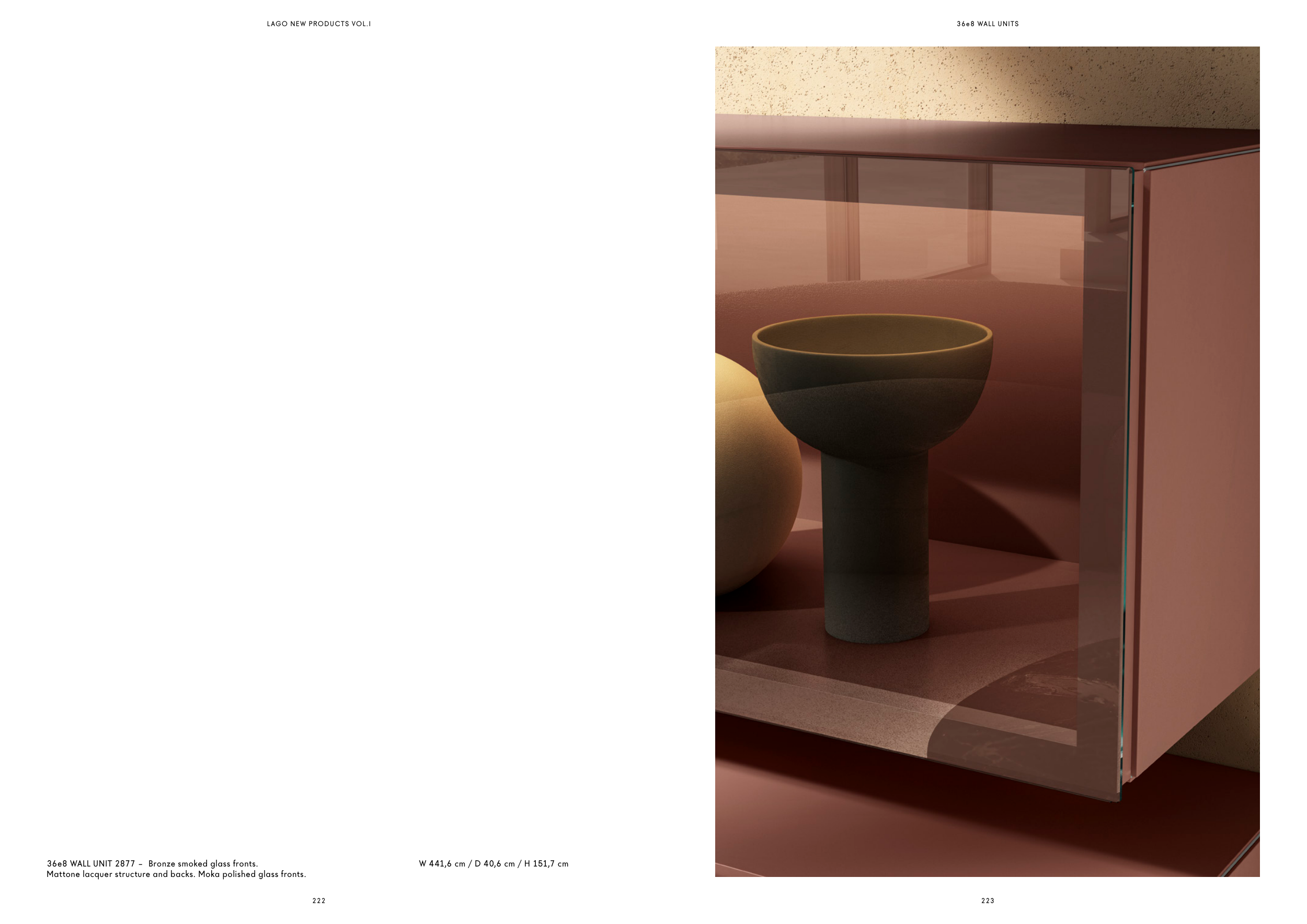 Mattone lacquer structure and backs. Moka polished glass fronts.