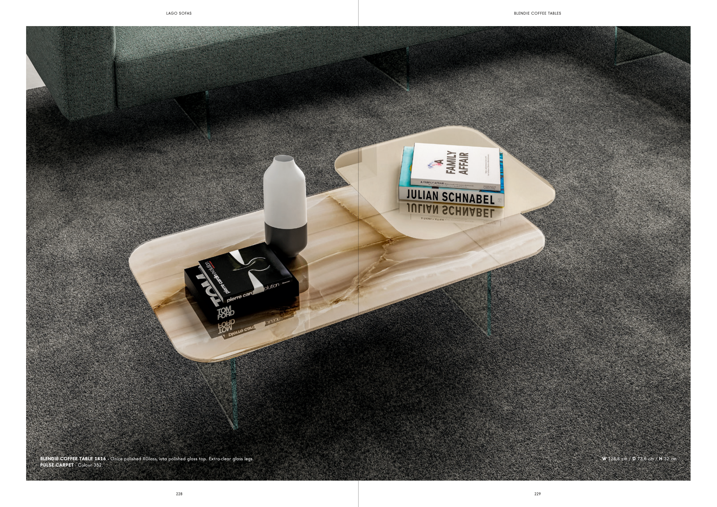 BLENDIE COFFEE TABLE 1416 - Onice polished XGlass, iuta polished glass top. Extra-clear glass legs.
