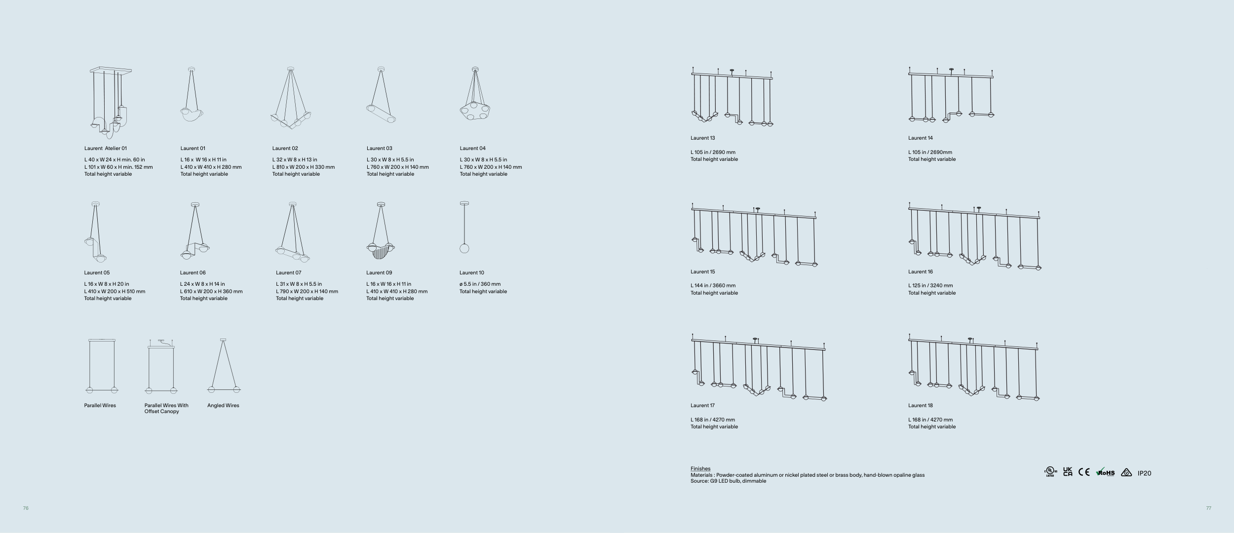 Materials : Powder-coated aluminum or nickel plated steel or brass body, hand-blown opaline glass