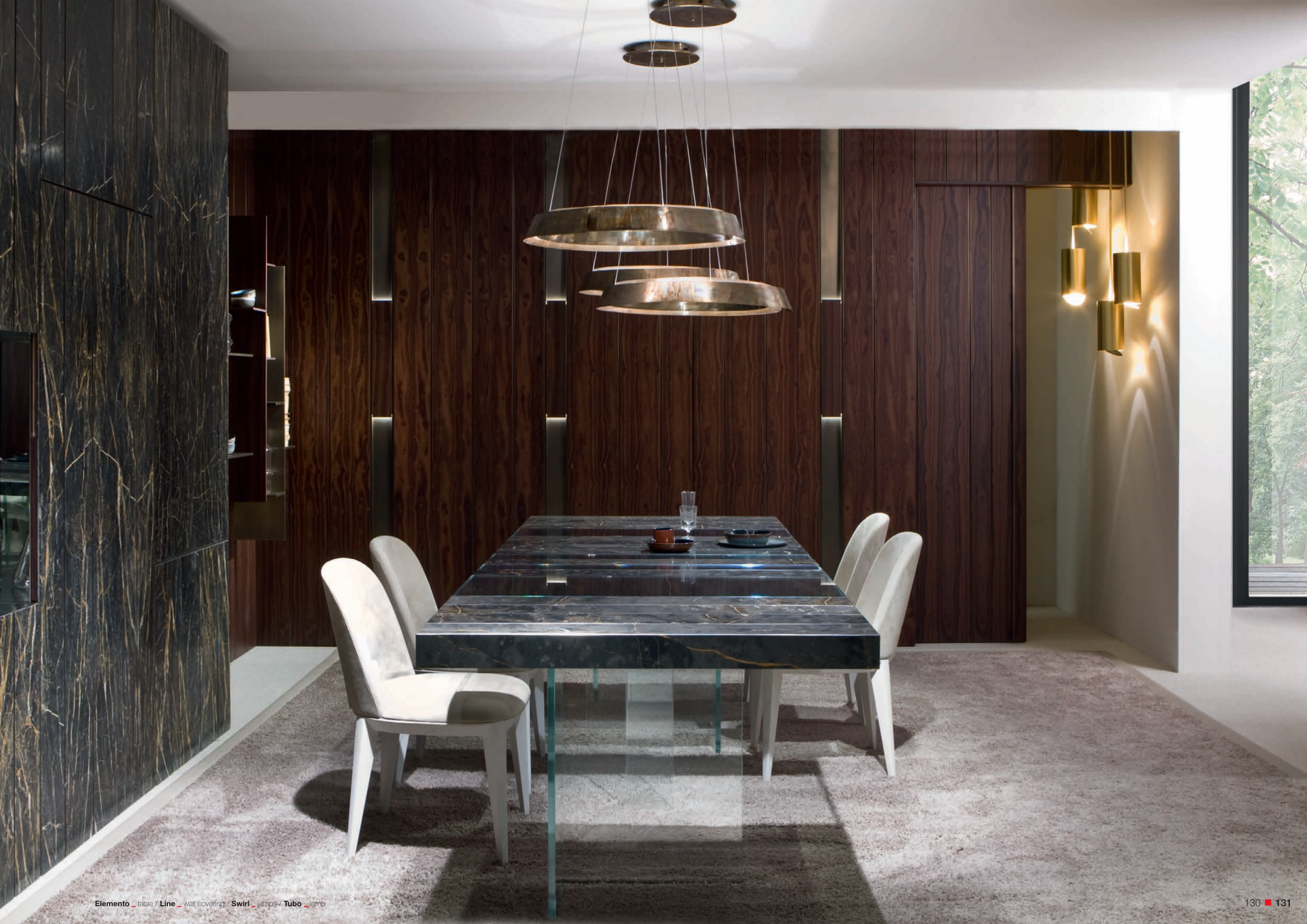 Elemento table / Line wall covering / Swirl lamps / Tubo lamp