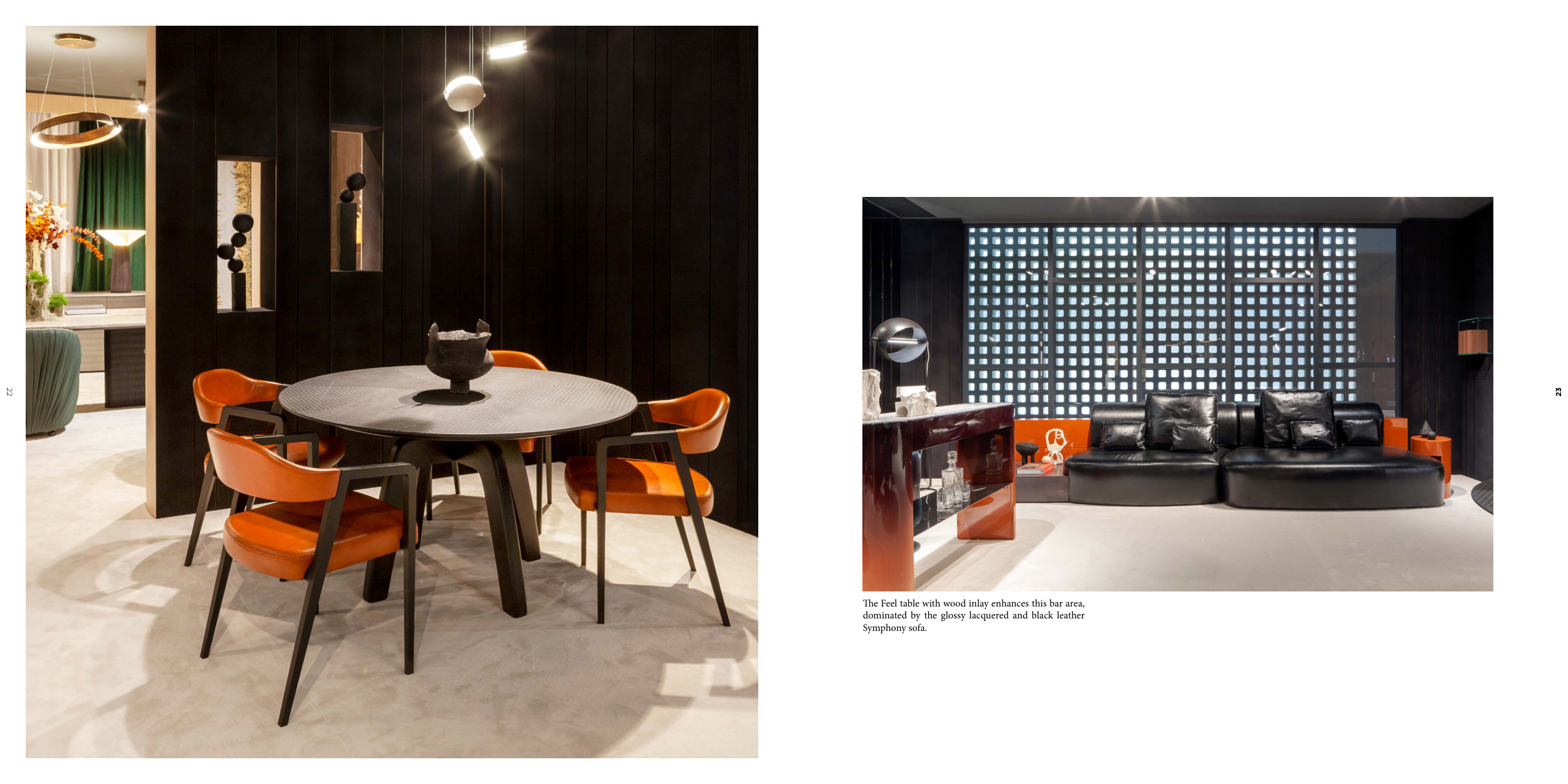 The Feel table with wood inlay enhances this bar area,