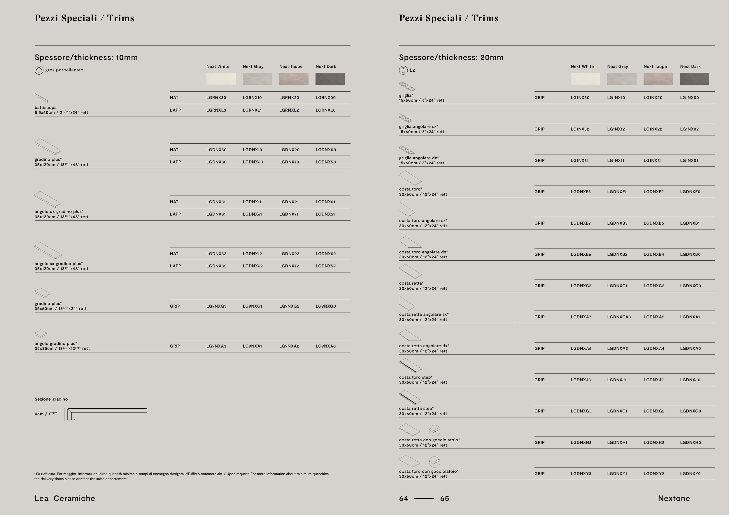 * Su richiesta. Per maggiori informazioni circa quantità minime e tempi di consegna rivolgersi all’ufficio commerciale. / Upon request. For more information about minimum quantities