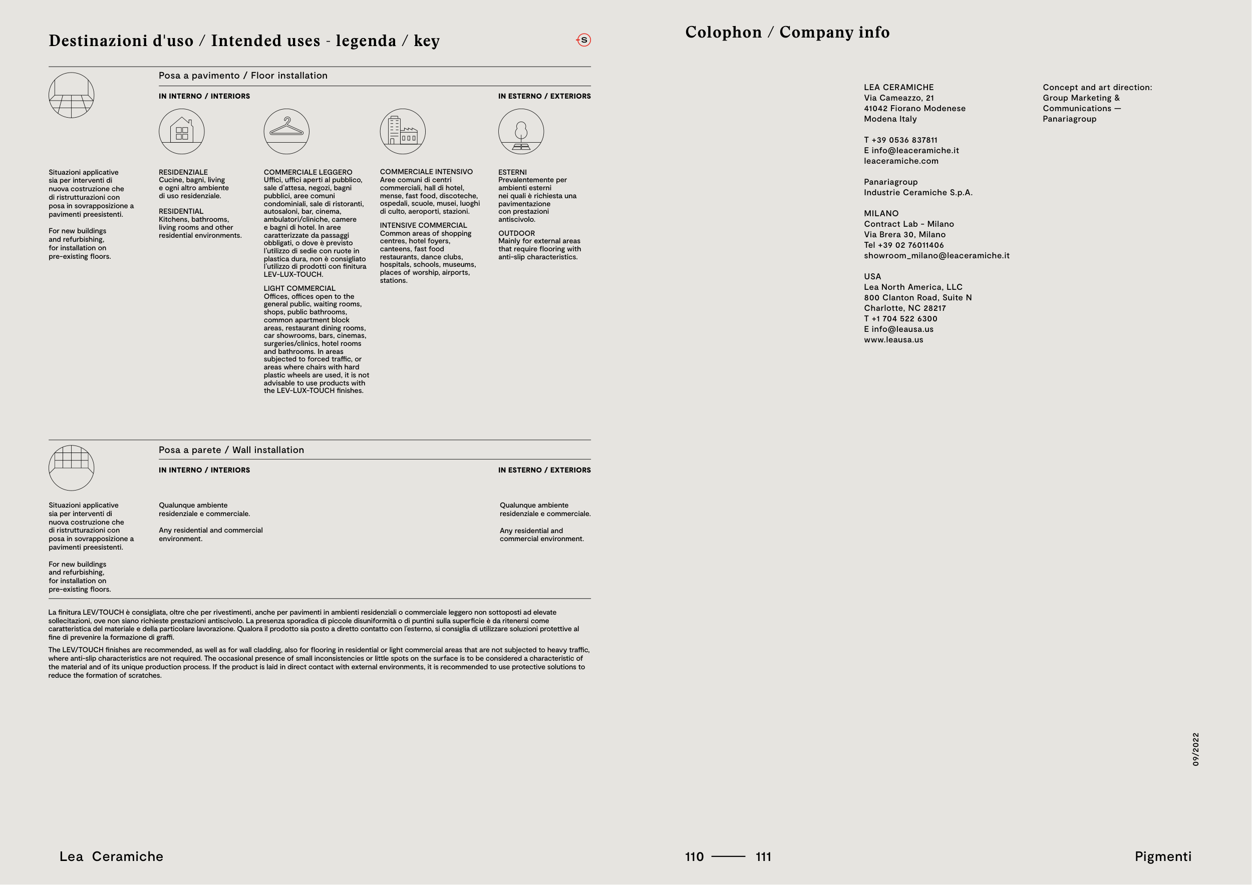 La finitura LEV/TOUCH è consigliata, oltre che per rivestimenti, anche per pavimenti in ambienti residenziali o commerciale leggero non sottoposti ad elevate