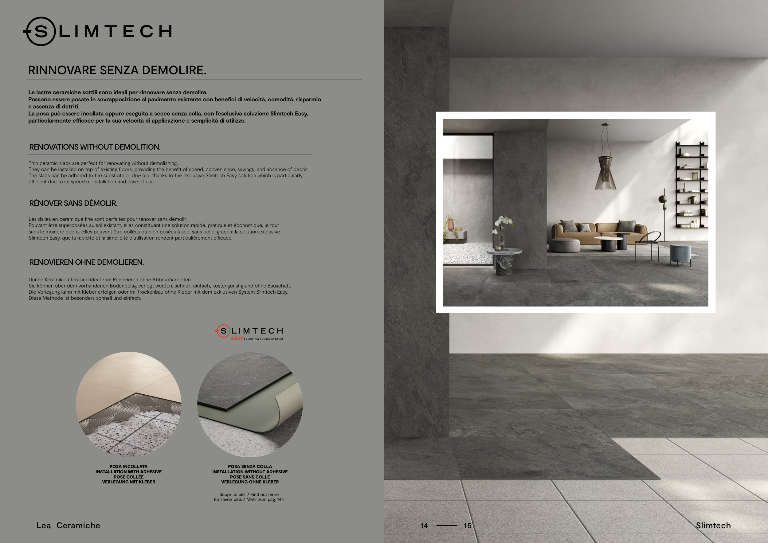 La posa può essere incollata oppure eseguita a secco senza colla, con l’esclusiva soluzione Slimtech Easy,