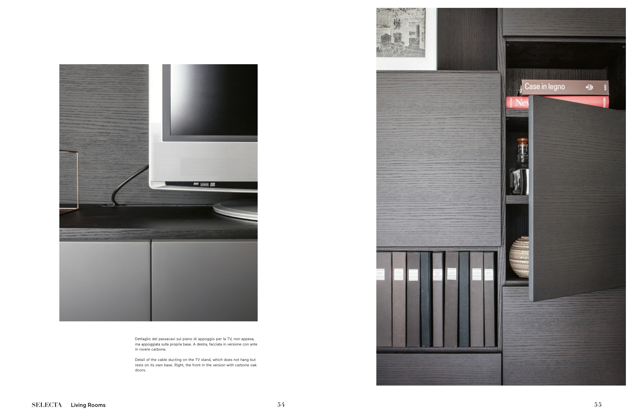 Detail of the cable ducting on the TV stand, which does not hang but