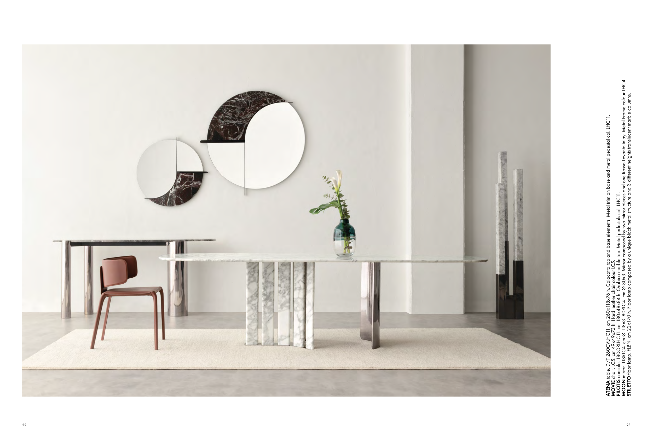MOON mirror. 118RLC4. cm Ø 118x3. 80RLC4. cm Ø 80x3. Mirror composed by two mirror pieces and one Rosso Levanto inlay. Metal Frame colour LHC4.